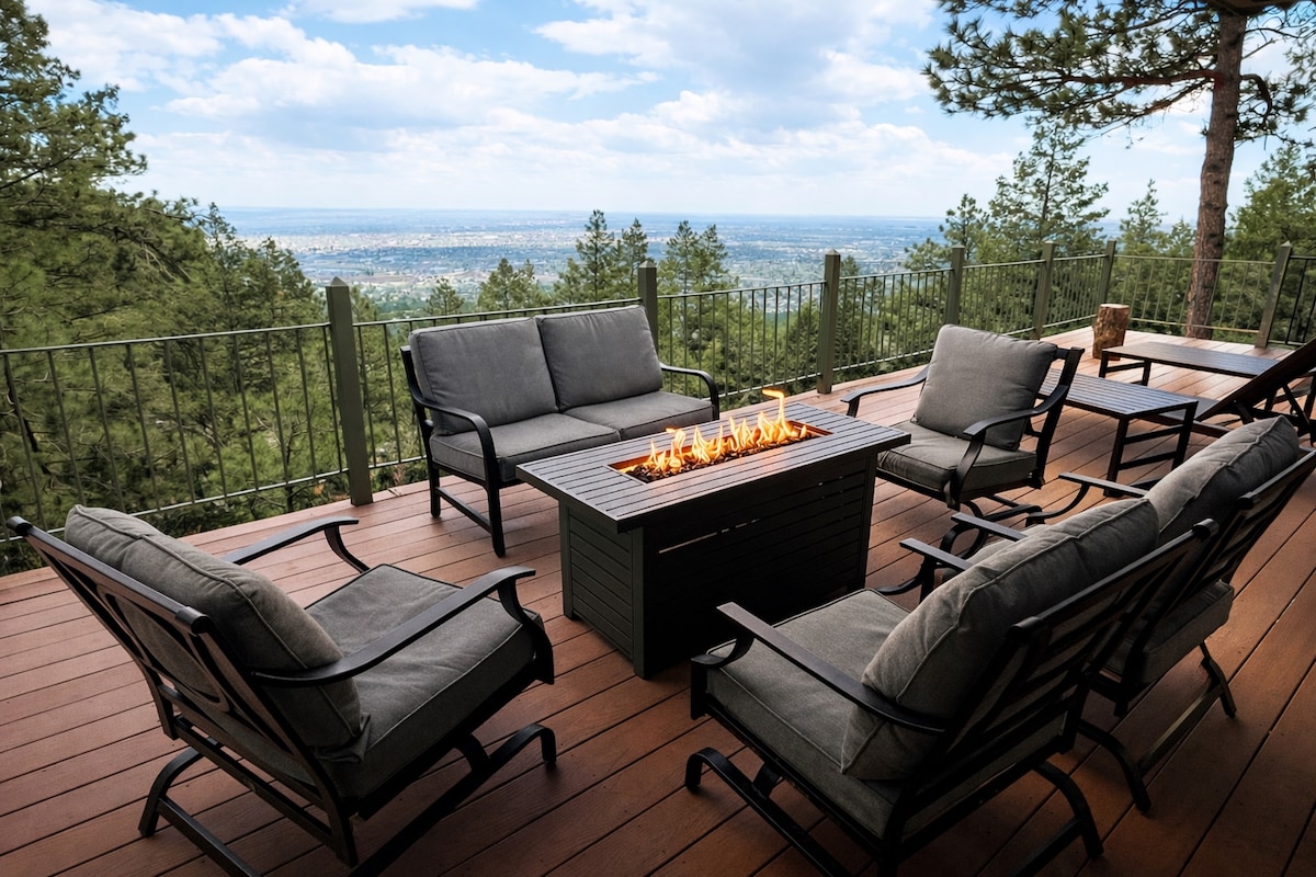 Welcome to your romantic & luxurious mountain retreat at Eagle Ridge! The Living Room is a stunning 1400 sf newly renovated home situated in a gated 43-acre property with panoramic views of Pikes Peak that will take your breath away. With a magnificent 1200 sf patio and access to private walking trails, this space has everything you need for a peaceful and rejuvenating vacation or retreat -- a hotel penthouse experience on ground level. The hot tub is filled with fresh water for every guest.