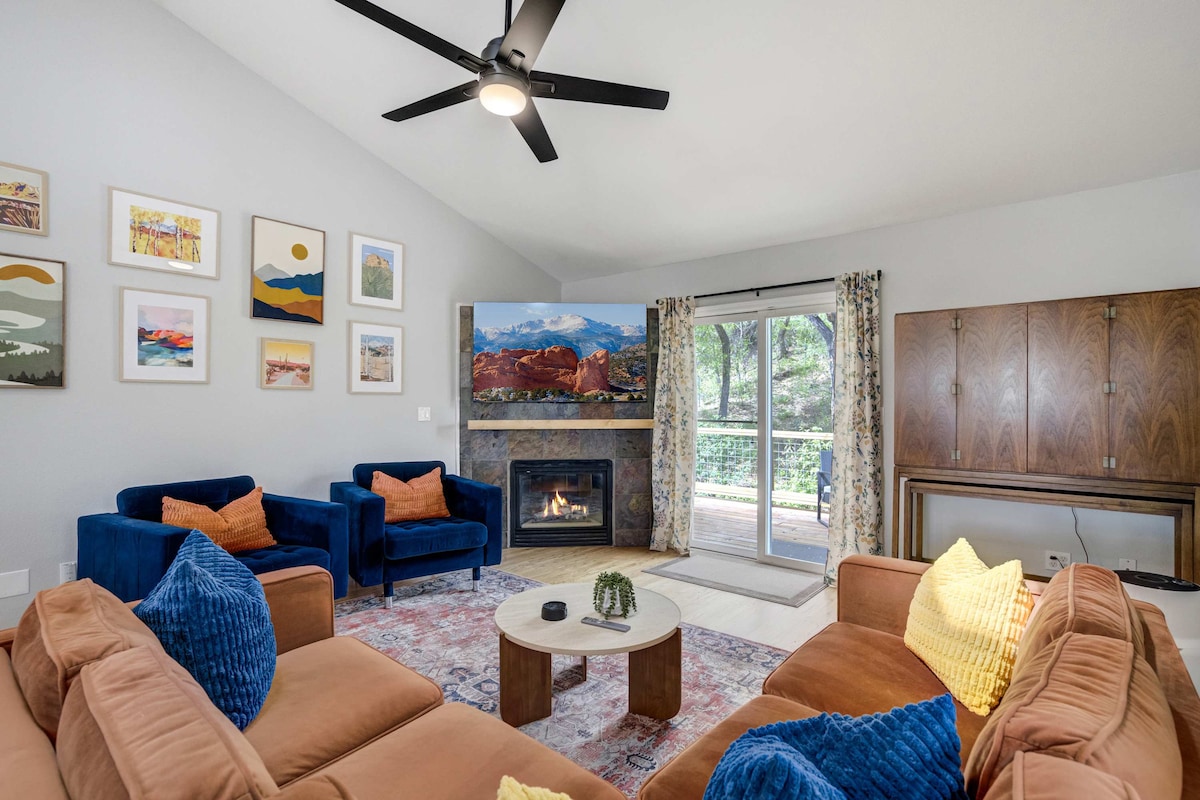 ★1 mile to downtown COS ★Short drive to CO College, Garden of the Gods, Pikes Peak, USAFA, UCCS ★Brand new 4-person HOT TUB ★LANDSCAPED yard w/FIREPIT & GRILL ★Fire place ★55” Smart TV w/ Samsung+ (basic channels + apps) ★Comfortable new KING + Queen bed ★Family friendly: Pack 'n play, high chair, toys, baby monitors & board games ★FAST WIFI, G00gle Home & desk area for BUSINESS TRAVEL ★Equipped kitchen w/wafflemaker, Hario V60, french press, blender & more! ★Driveway parking ★Free Colorado soda