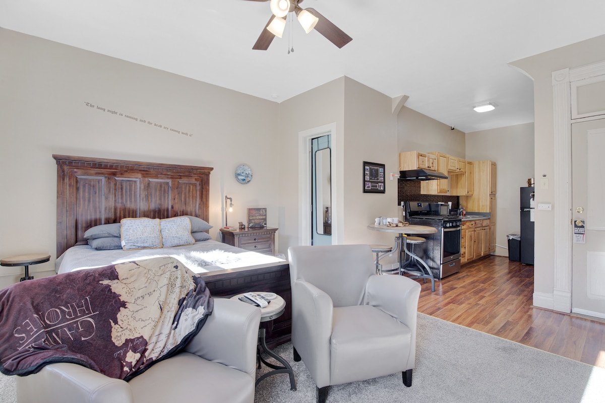 EXCLUSIVELY on Airbnb! Our STUDIO KITCHENETTE has a single queen bed. Designed in a one-of-a-kind retro flair, this room is uniquely arranged with a modern-rustic kitchen, tasteful furnishings and spacious bathroom. Vintage accents, full sized retro appliances, Keurig style coffee maker, and a large HD TV give a taste of rustic luxury in the Colorado mountains. AMERICAN CLASSIC INN is reshaping the guest experience - our renovated motel is a charm waiting to be discovered. *NO cleaning fee!*