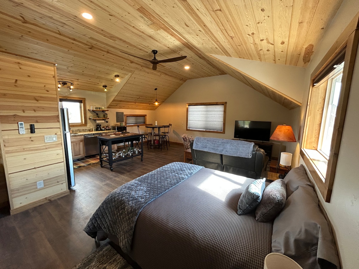 Kick back and relax in this calm, stylish space. Enter the gated 5 acres into a lush green oasis. The studio has a sunny welcoming deck with dining umbrella covered table, plenty of seating and lounging area. Newly remodeled studio with full kitchen including granite countertops, floating shelfs and tons of natural light. The cozy living room area has a midcentury modern leather couch and a coffee table with lift top for working. Climb the stair ladder to the loft bunkbed area with 2 queen beds.