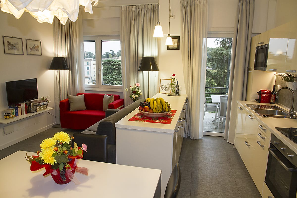 Suite for 2 guests: bright living room, comfortable balcony, kitchenette, bathroom with shower and 1 bedroom with a comfortable double bed. Decorated with Italian design pieces and artwork. It is on the 3° floor of a 4-storey building, in a tree-lined street in a quiet part of Trastevere, a few meters from Piazza S. Cosimato and Viale Trastevere within walking distance of bars, restaurants and shops, which can be reached in 5 minutes on foot. AC, Central Heating, Fast Wi-Fi, Smart Tv, Elevator