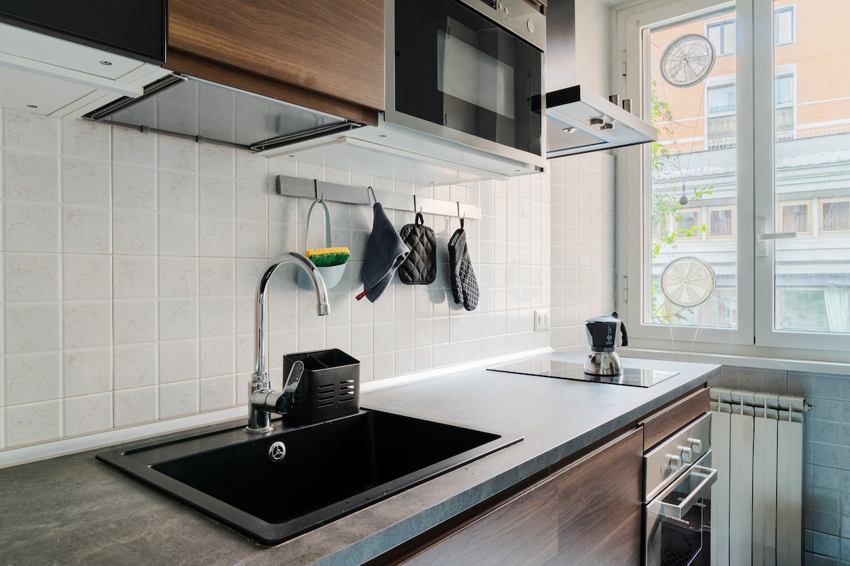 Apartment with one bedroom with king size double bed, living room with double sofa bed, one bathroom and a fully equipped kitchen, near the Colosseum. Modern and completely renovated for 3 people. This is a Green solution: 100% renewable energy, fully LED lighting, green cleaning products, eco-friendly Airlite wall paint, eco-friendly soaps and ethical finance. Connected and close to monuments and services. Comfort and professional cleaning for a wonderful holiday!