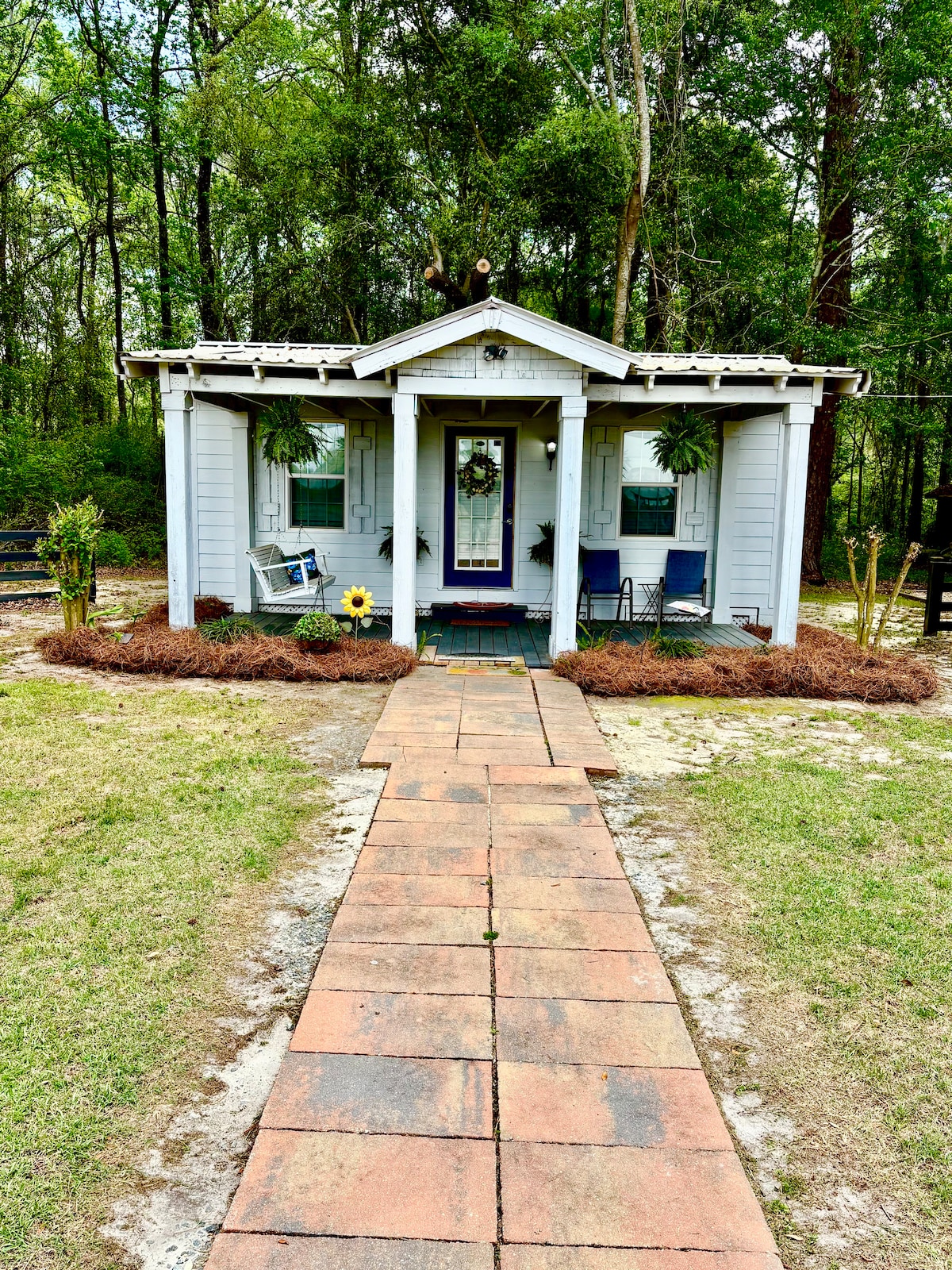 This is a wonderful 2000 sq. ft. 3 BR / 2 bath house with a den, LR, DR, Kitchen and laundry room plus a full front porch with a swing and rockers, a back deck and pergola with seating and swing, and a 2 car carport and gravel driveway on 5 acres surrounded by a loblolly pine tree farm. We have high speed fiber internet/WIFI. We have 3 smart TV's with a DVD player and board games, as well. Our kitchen is well stocked for most cooking needs.