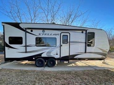 Two-bedroom spacious camper with 3 slide outs and an island sink in the kitchen for extra space to cook. Kitchen has a stove, oven, microwave, refrigerator, pantry and a coffee bar area. This camper can sleep up to 8 people comfortably. The outside of the RV features a large awning, an outdoor kitchen with a refrigerator, sink and more storage. Our trailer is equipped with everything needed for a comfortable stay. All you need to bring is your personal items and we provide the rest for you!