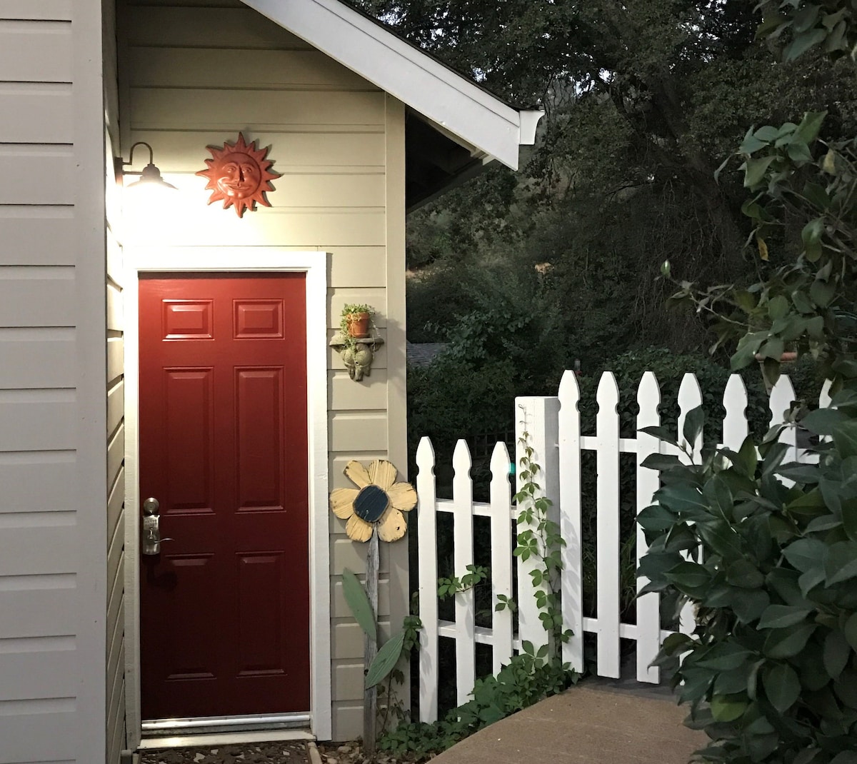 The Hideaway is an enchanting one room casita situated on the outer crest of the property, The Confluence. Wake up to the sunrise with a lush *View* of the natural countryside from your private deck. The Hideaway is accessed by a foot path (200ft) from the Main House. The Private Bathroom is off of the Main House (200ft walk from the room). From the parking area to the room, it is roughly 400ft. There is no kitchen or cooking appliances other than a hot water kettle and a mini-frig.