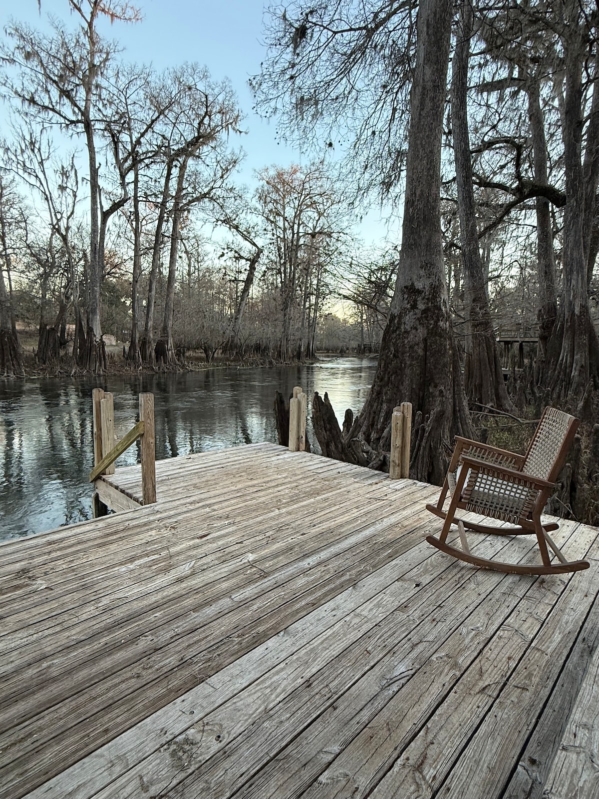 Our front yard is the Santa Fe River. Come enjoy a nature retreat in this cypress log home! Right by Tree House spring and nestled between two state parks, but less than five minutes to downtown. Whether you are looking for rest and relaxation or recreation, our home offers both. Take in the scenery and catch your dinner from the riverbank. Recline in the sunshine on our dock (12’ x 12’). Keep an eye out for otters! It is a two hour float downriver to Poe Springs, Rum Island, and Blue Springs.