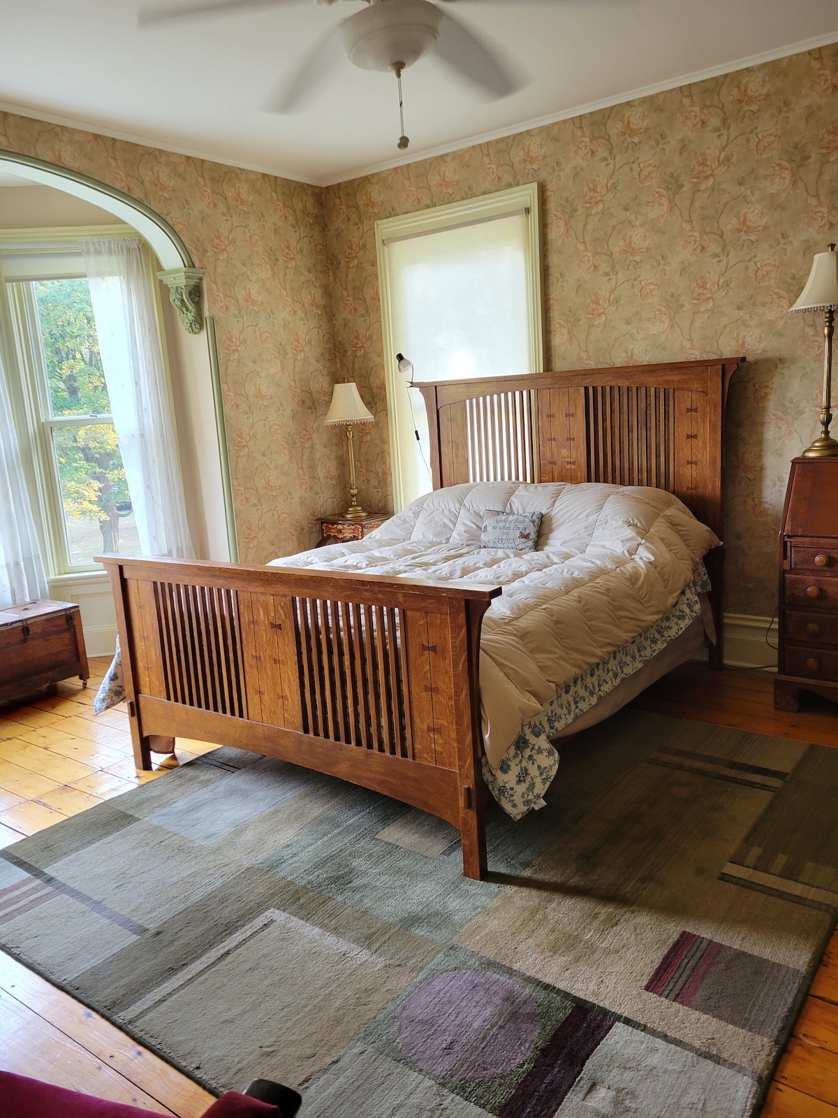 FREE private parking. - Late Check-in: Until 12am / Breakfast is not included - We currently do NOT provide transportation - Same Day: Allow 2 hour prep. Private staircase - FREE WIFI - Built in 1848, HISTORIC - Be good with winding stairs (have no mobility issues) - Work remote! Private back porch doors. 2 QUEEN SIZE BEDS - Smoking on porch. No pets. Kitchen not included. Wares provided. Full bathroom. Microwave & Fridge & Ice Compartment Check-in starts: 4PM