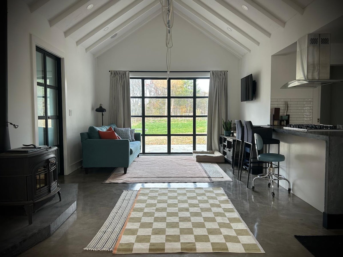 Built from a saved, moved, & reconstructed 1850s- era barn from a former local dairy farm, this upstairs studio space features views of the Berkshire Mountains and walking paths on the 5 acre grounds. 20 mins from Jiminy Peak. 20 mins from Tanglewood Music Center. The space has a queen bed, sofa, kitchen area with fridge, sink, oven, stove, microwave, Keurig and coffee, toaster, and cooking essentials. **EV Charging Station coming sometime summer of 2023. We'll update when available.