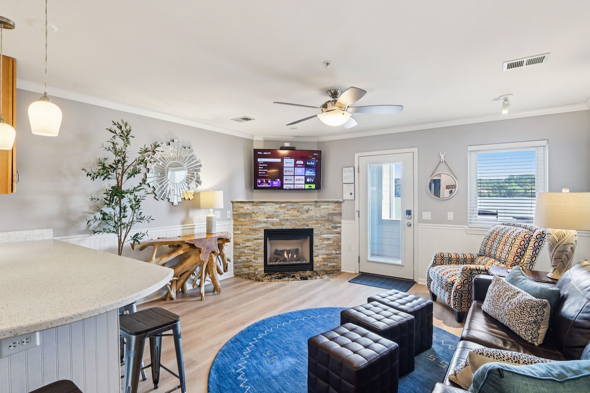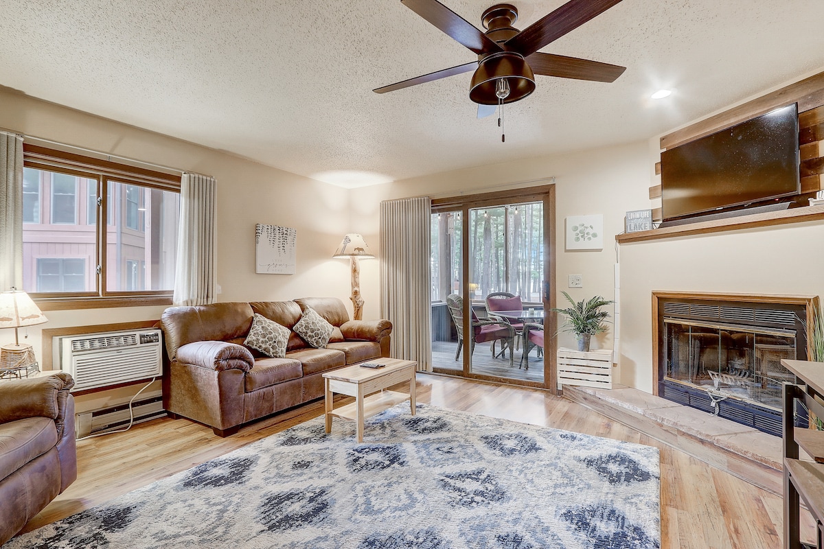 Hello, Welcome to our home! Relax in our cozy 1BR condo (688 sq ft), steps from downtown. Sleeps 4—queen bed with in-room Jacuzzi and a pull-out queen sofa bed. 📍 Ideal Location: Near downtown fun! 🌅 Peaceful Retreat: Serene river views! 🍽️ Convenience: Full kitchen & outdoor grill! 🏊 Clubhouse: Pools, hot tub & sauna! 🚤 Private boat slip included (please contact host) Book your getaway today!