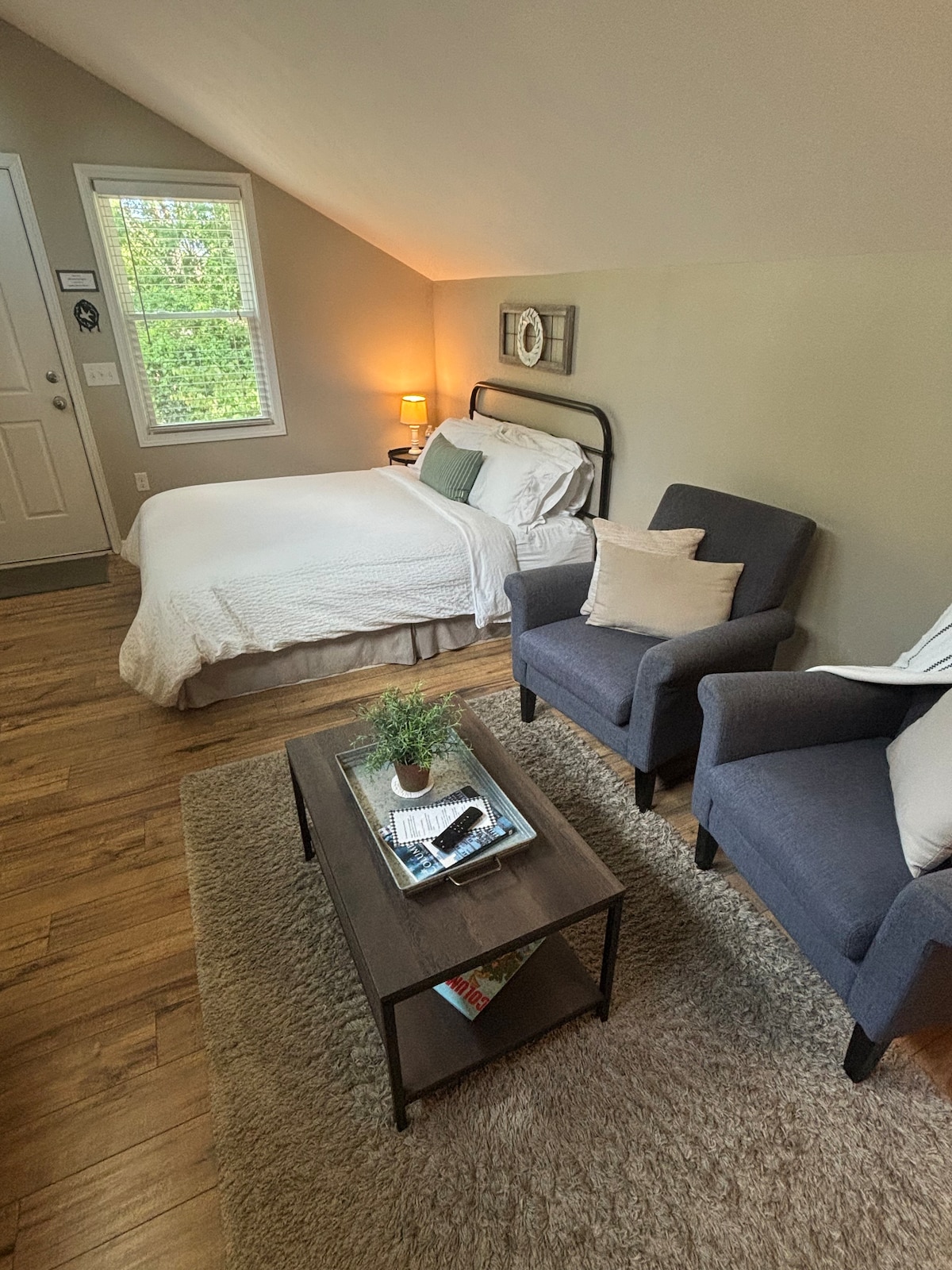 Relax and unwind in this cozy, centrally located studio. Perfect for travelers, the space features a comfortable double bed, work desk, cozy reading chair, and TV for your downtime. The kitchenette area includes a microwave & mini fridge with ample coffee & tea supplies, while the bright bathroom offers plenty of natural light. All the essentials you need for a comfortable stay. **Checkout on a Monday for more options at a discounted Sunday rate.