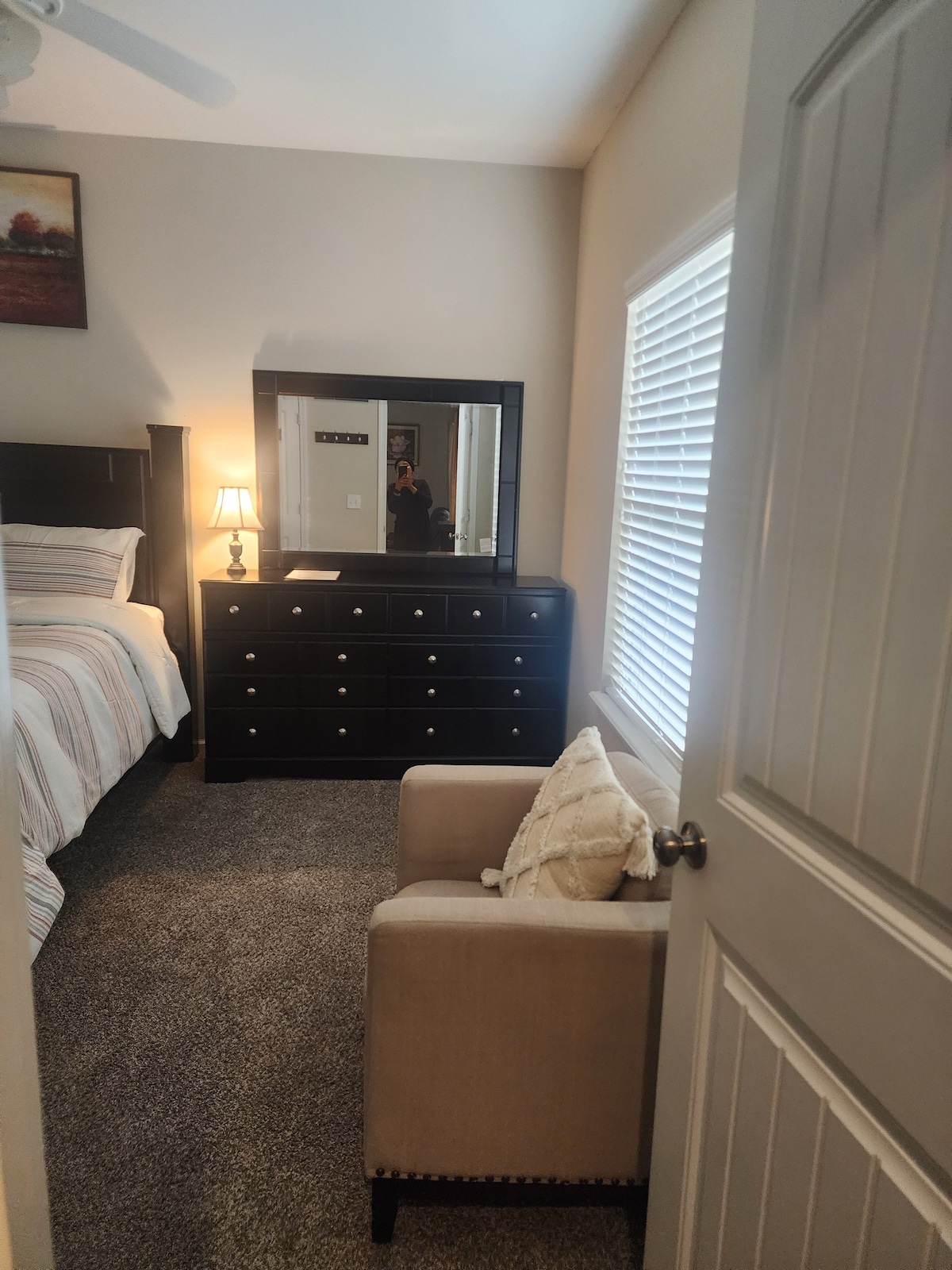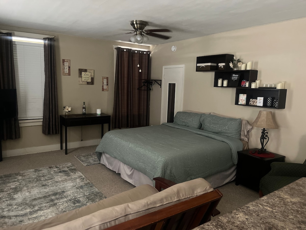 Enjoy this large walkout basement studio apartment that will take you back in time. Nostalgia galore, this studio features an electric and bass guitar as well as many artifacts from the 70's. This space is in our basement and has a private entrance in our fully privacy fenced backyard with a covered porch. Well behaved dogs welcome. Kitchenette includes fridge, toaster, air fryer, microwave, and coffee maker. Perfect for a quick couple's getaway or a single traveler.