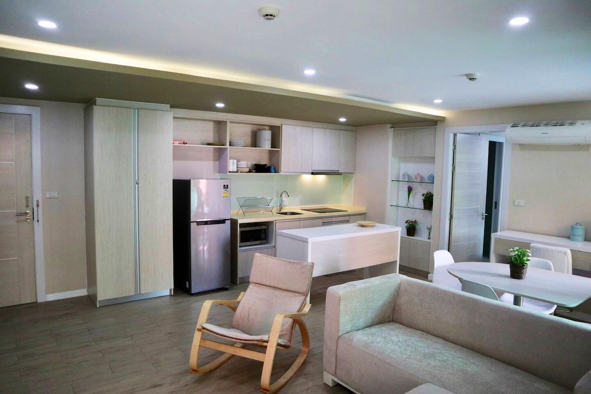Spacious and cozy 2BR modern apartment only 300m from the Beach. 50sqm living room with home cinema system. Modern kitchen equipped with a dish washer, 5 Ocean View Balconies, one being a 25sqm Sun Terrace with a fantastic Ocean View. Fiber Optic Internet 500/500MBit included. Electricity, water and Netflix are included as well. The nightly price is set in Thai Baht, to avoid a little extra fee, choose THB on airbnb as a currency prior to booking.