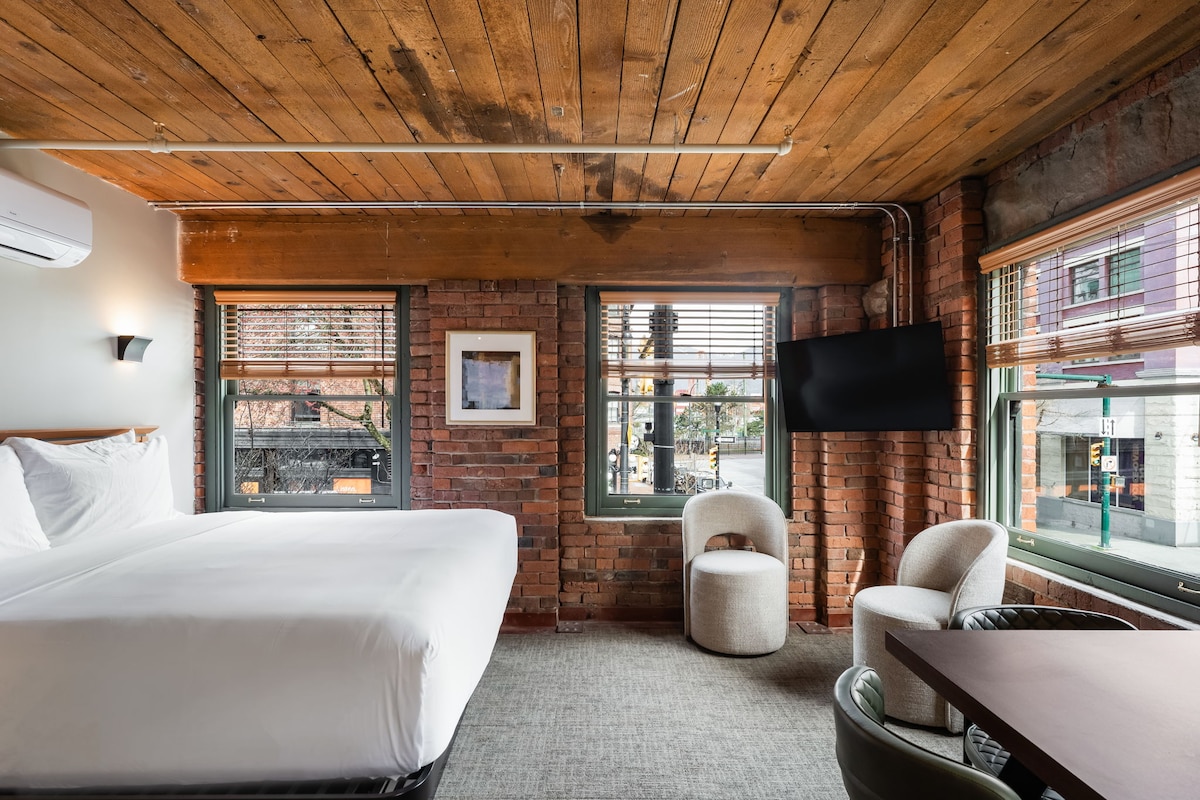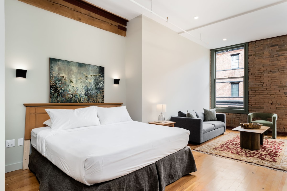 A spacious loft suite at Block House, a boutique aparthotel set within a Gastown heritage building. Features a king bed, full kitchen with dishwasher, fridge, stove and microwave, living area with sofabed, original exposed brick walls and hardwood floors. Private en-suite bathroom with stand-up shower, plush linens, robes and Tallu bath amenities. Shared laundry available on-site.