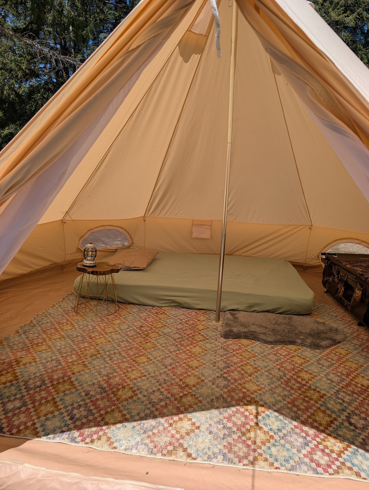 Our bohemian themed GLAMPING tent is situated on its own quaint camping lot. This is an off-grid site. No running water or electricity in the tent but you would never know it. Romantically lit with candle light! Hear the rain drops hit the canvas or wake to the birds chirping. Equipped with all you need to just pack your bag of clothes and food ! We hope we have thought of the rest !