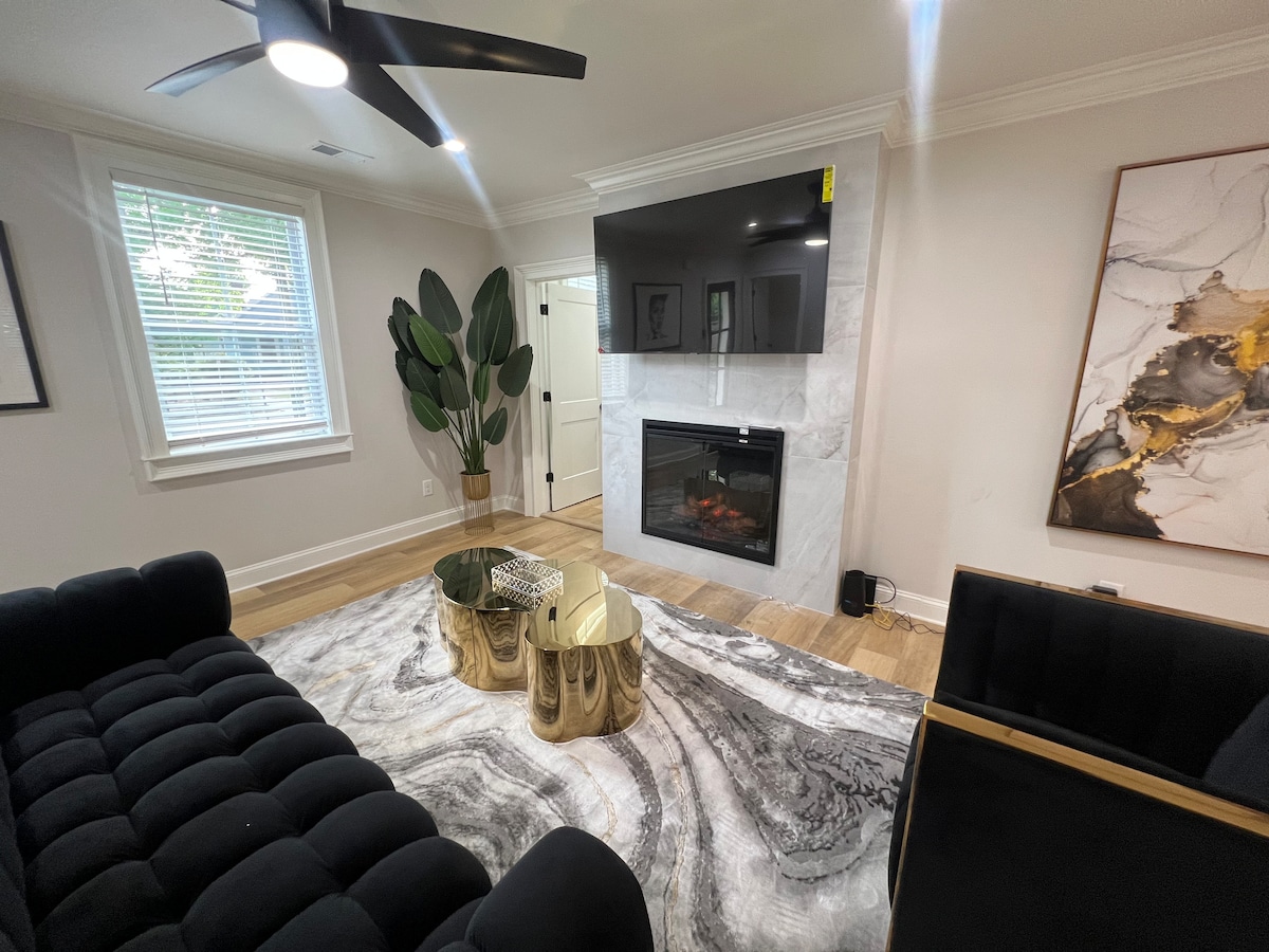 This extensively renovated, modern one-story ranch-style home boasts nearly 2,300 sqft. of space and a sizable backyard. Featuring 4 expansive bedrooms with Smart TVs, 3 full baths, a cinema room equipped with a 4K projector and a 120-inch screen, cozy reading nook, dual decks, a fire pit patio, and abundant dining space, this residence offers ample comfort and entertainment choices. Located just minutes from downtown, it provides easy access to a plethora of dining venues and local attractions.