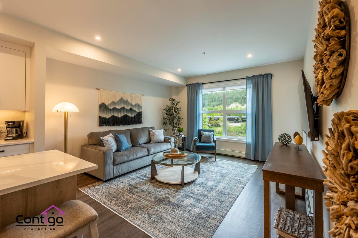 This brand new two bedroom condo is flooded with natural light, has outstanding mountain views and overlooks the river. Contemporary open floor plan, an artistic and cozy place that sleeps up to 4 and is ideal for couples or a family. Centrally located downtown, you are just steps away from your favourite cafes, shops and restaurants. You are minutes away from the ski hill and Moonraker/CBT bike trails, and right on the river pathway. Provincial Registration # H391623453