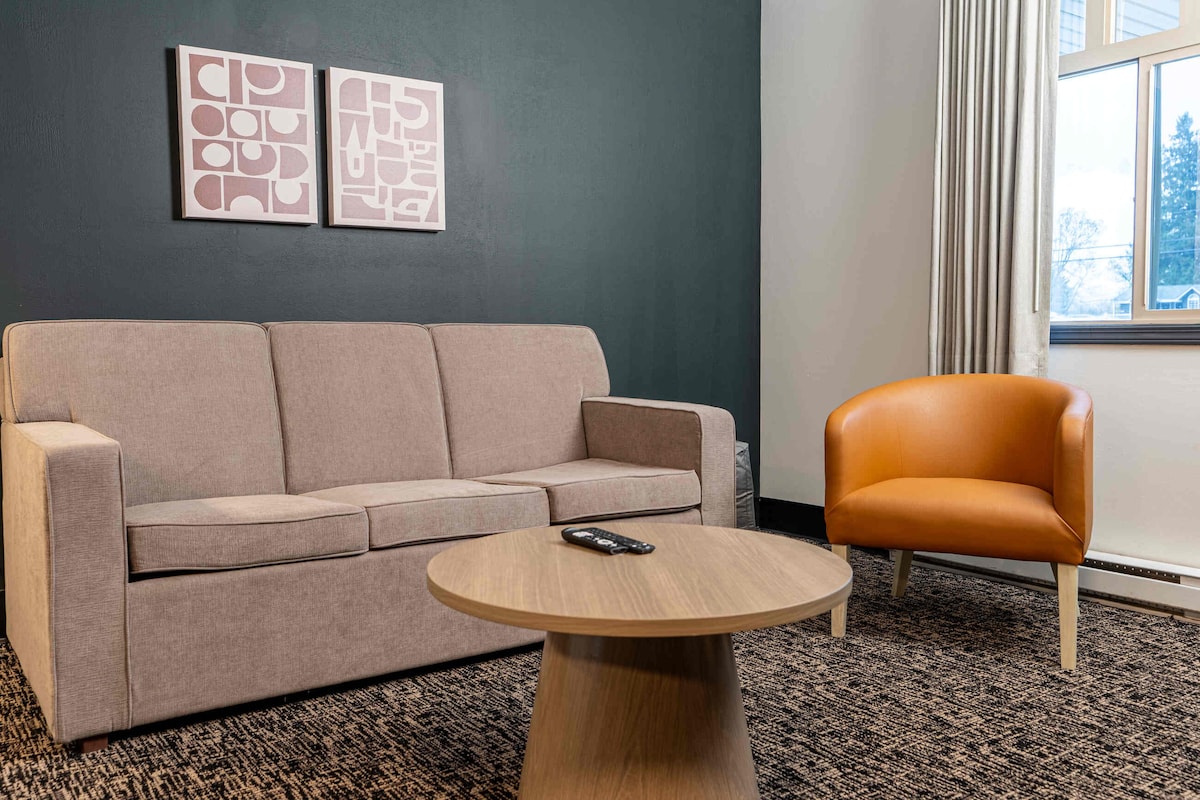 Enjoy our room in the VRGE Hotel Revelstoke featuring 1 King Bed and a double sofabed (sleeps 4). The living room includes a coffee table and is equipped with a TV with casting capability and coffee maker. The attached full bathroom features a spacious shower. Located on the 2nd floor this 1970's inspired Nordic design hotel room offers a separate living area for added comfort and convenience, along with contactless check-in. Convenient access to guest gear storage is available free of charge.