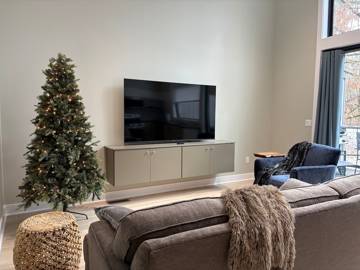 The "Dreamcatcher" Treehouse is a unique secluded hideaway perched high above the scenic ravine and rolling creek. In an enchanted wooded setting, a winding gravel pathway leads to the whimsical rope suspension bridge entering the treehouse. Stunning views await from floor to ceiling windows, and the spacious cantilevered deck with oversized hot tub and glass fire pit. With upscale modern design featuring beautiful cozy interiors and comfort at every turn, your stay will be a welcome retreat.