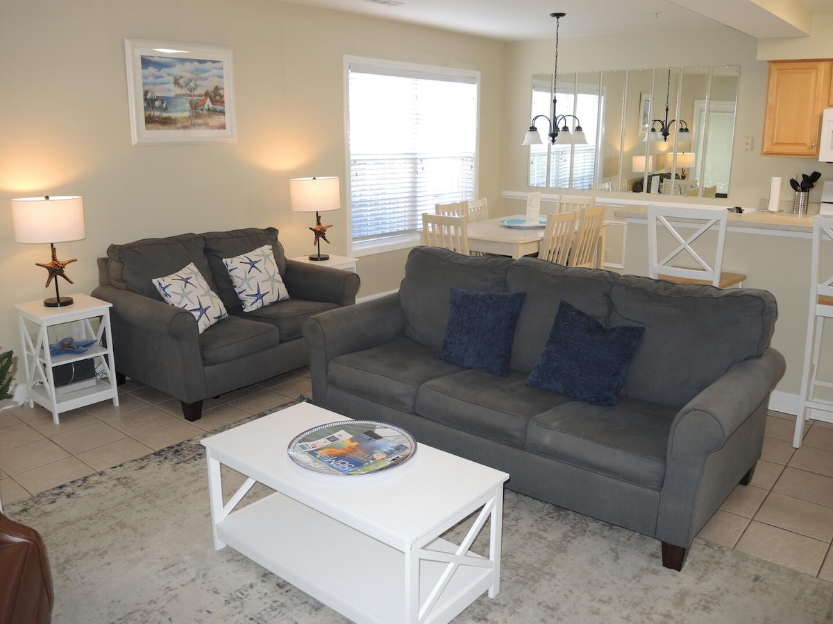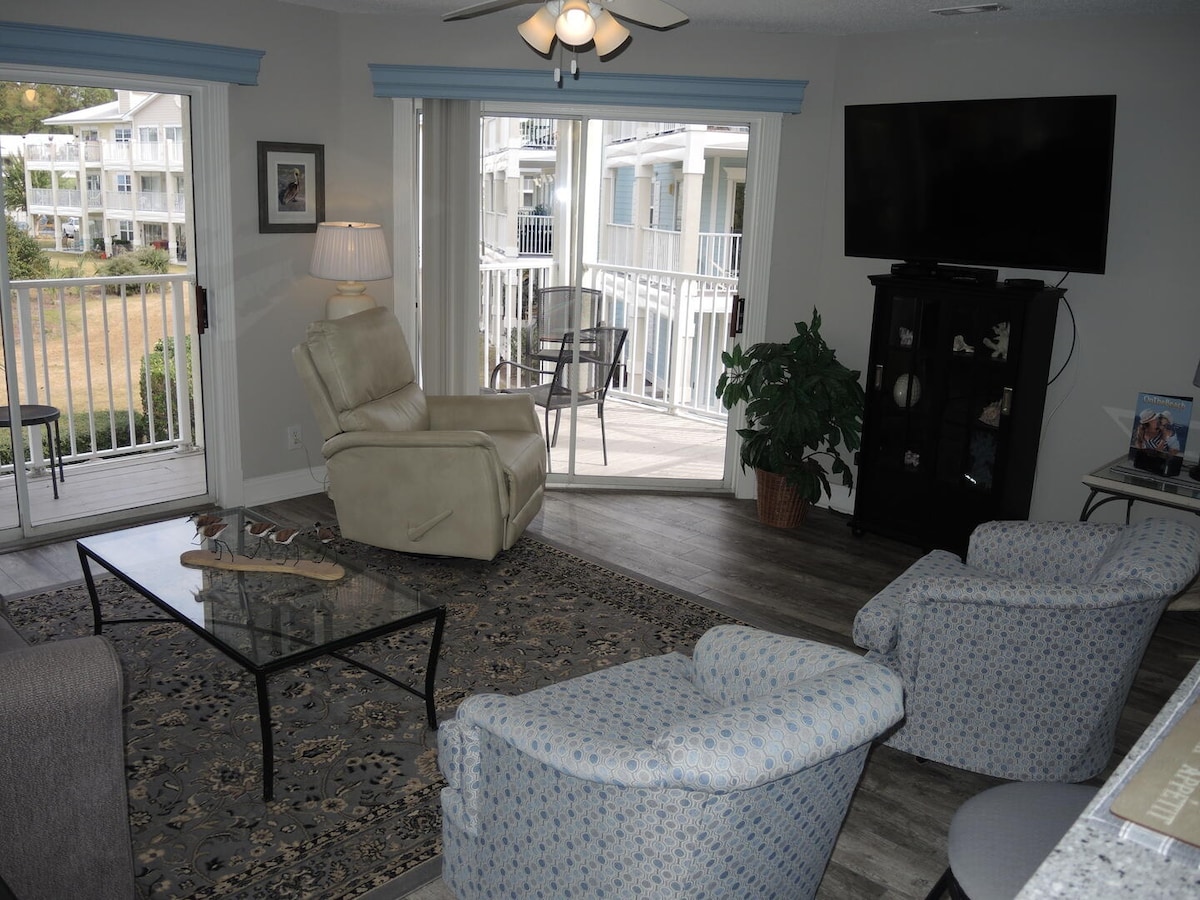 2Br/2Ba Ground Floor Unit On The Golf Course, Sleeps 4-6 Bright living space with sliding glass doors in the living room 55" HDTV and large dining room windows. The main bedroom features a king size bed, HDTV and bath. The second bedroom features 2 full size beds, HDTV, a kitchenette and a private bath with a tub. Fully equipped kitchen includes coffee maker, dishwasher and ice maker. W/D included for your convenience. Linens and towels are provided. Roku streaming included.