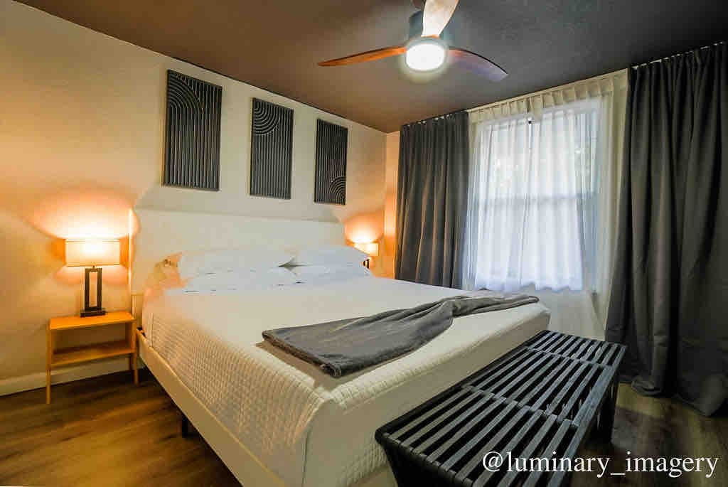 Welcome to our charming apartment, ideally situated just one block from serene Lake Bottom Park and less than a mile from vibrant midtown bars and restaurants. Our recently renovated, first-floor apartment features two cozy bedrooms with queen beds and one bathroom. The unit includes a modern kitchen and an in-unit washer and dryer, ensuring all the comforts of home. The thoughtfully curated artwork throughout showcases Columbus, GA's rich history.