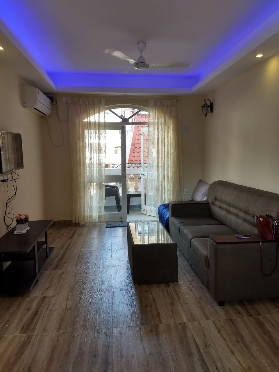 This 1 bedroom flat, located a mere 500 meters from Colva beach in South Goa, offers an ideal setting for both families and couples. 88;261 ×125"93 Featuring a spacious living area connected to a modern open kitchen equipped with all essential amenities, residents can step into a large balcony to admire the swimming pool view. The interior layout boasts a bar-style design. Guests have access to WIFI and backup power via an inverter