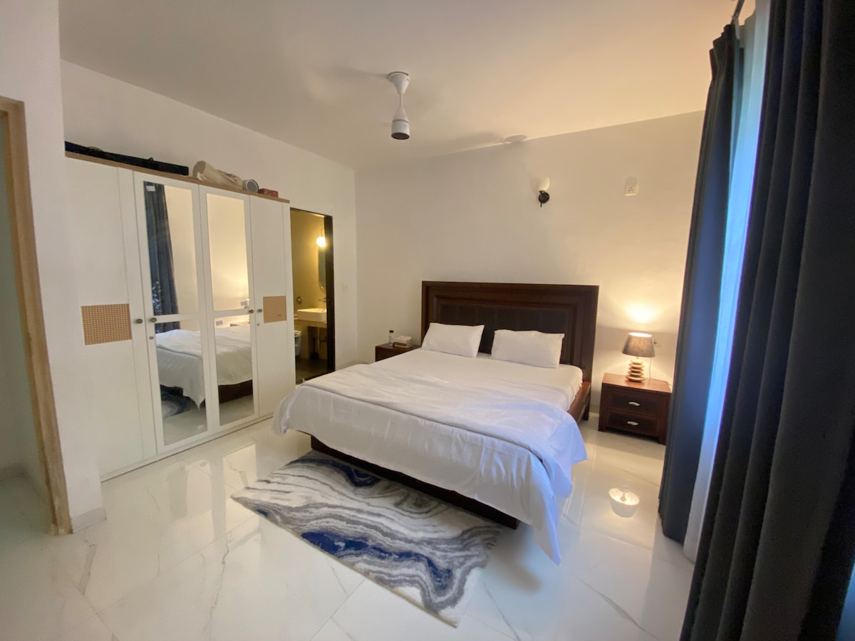 This 2-bedroom flat, located a mere 500 meters from Colva beach in South Goa, offers an ideal setting for both families and couples. 8826_1125_93 Featuring a spacious living area connected to a modern open kitchen equipped with all essential amenities, residents can step into a large balcony to admire the swimming pool view. The interior layout boasts a bar-style design. Guests have access to WIFI and backup power via an inverter