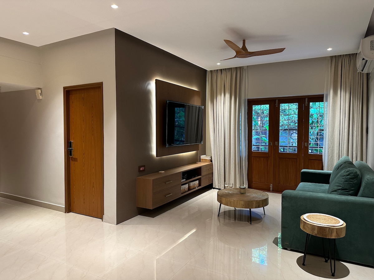 ****Newly Opened Pool**** A cozy studio nestled in lush green surroundings in a well guarded neighbourhood of beautiful houses, just 300 meters away from the beach. Excellent for couples, old and young and small families. Packed with all modern amenities, ample parking and vibrant interiors to make your stay comfortable and above all, memorable! So when are you coming?