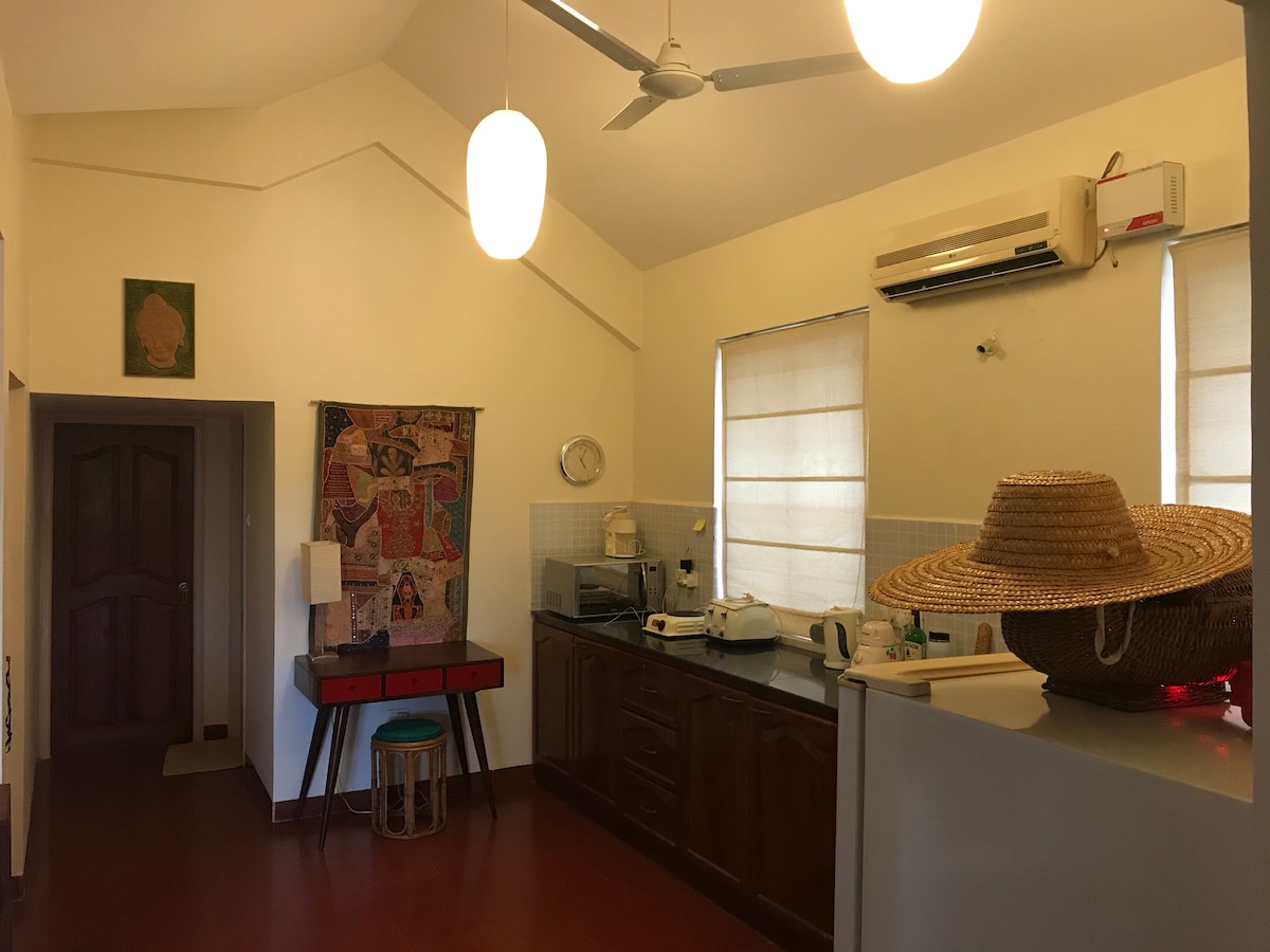 An newly renovated, minimalistic interiors home. The common areas are spacious for a group gathering. Enter into the oasis of calm and serene, the surrounds are lush green with superb accessibility to supermarkets, beaches, and restaurants. Work-cation or a vacation, we have a fully functional WIFI connection to suit your needs. We have a well equipped kitchen to experiment with your cooking abilities. Well within the range of food delivery services, the nearest beach just 10 mins walk away.