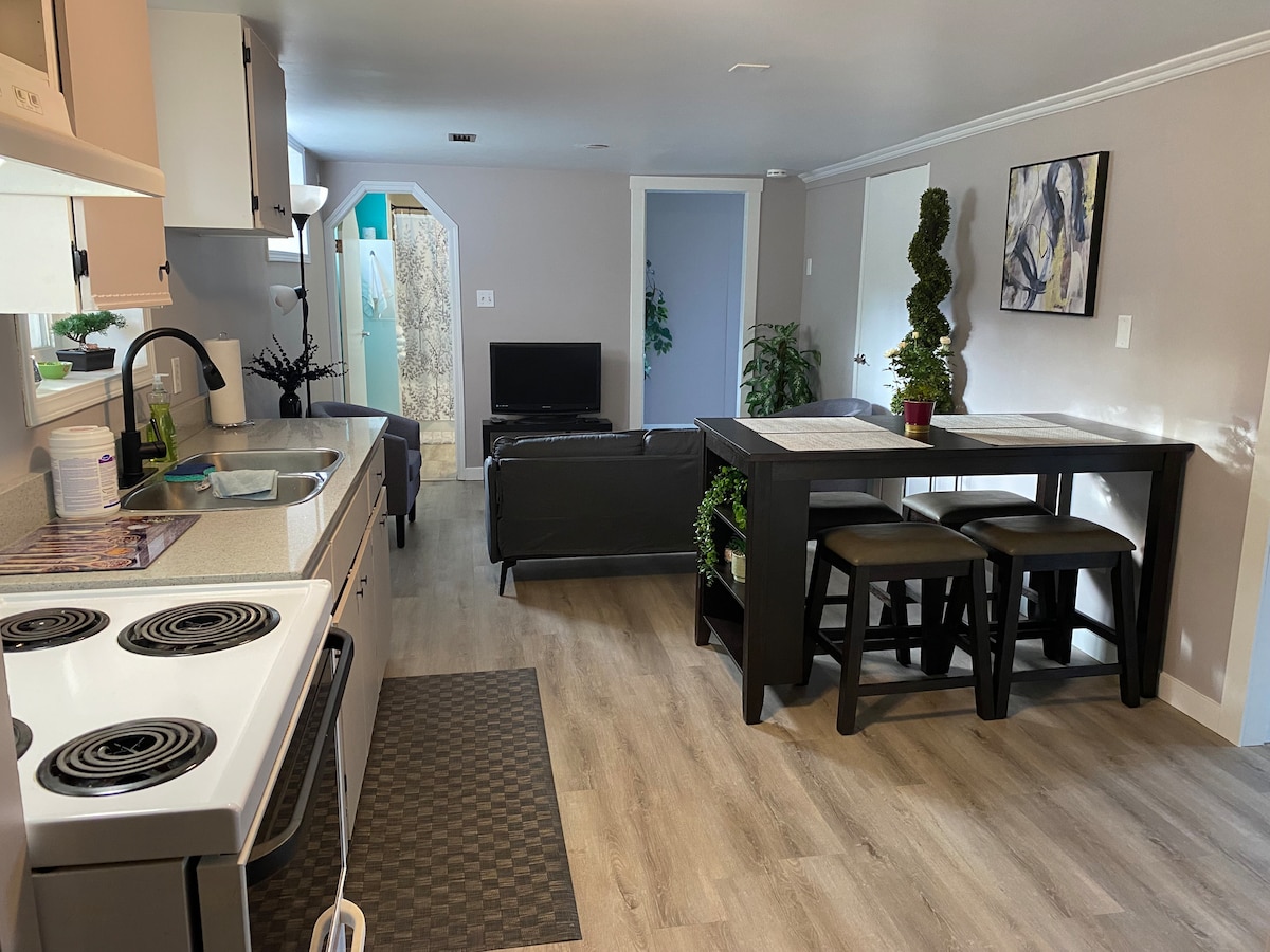 Welcome to our cozy ground-floor studio in a cul-de-sac neighbourhood! Perfect for two, our space features a private entrance, really cozy queen bed with leather headboard, 4k UHD 55” TV with Netflix, private bathroom, toilet with bidet, coffee maker, kettle, and dining table that doubles as a workstation. Enjoy free Wi-Fi, and central heating/cooling. Free driveway parking for 1 car is available. Book your stay today and experience the perfect blend of comfort, convenience, and privacy!