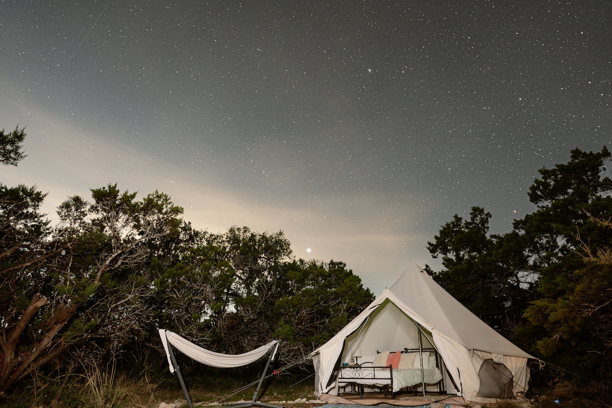Whether you're looking for a romantic escape or a girls-only getaway, you've found the perfect place in this Authentic African Safari Tent with (AC and heat) set on a hillside in Wimberley only minutes to Blue Hole or downtown! Dreams await in the king-size bed, soft Comfy Brand sheets, and plush pillows. Custom-designed chandeliers, leather seating, private pool, soaking tub, blackstone grill and all the fun details make this space one of a kind.