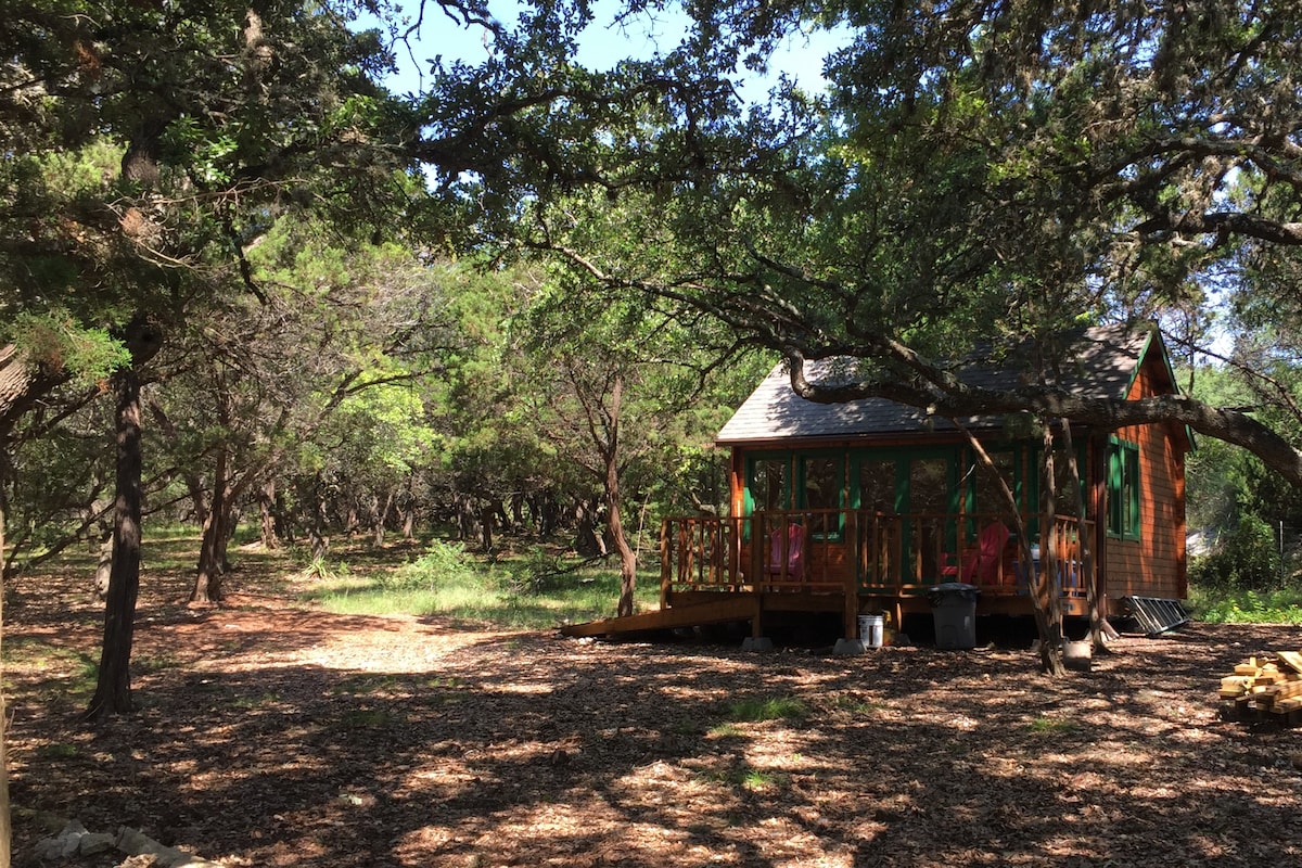 FoxHollow cabin offers a peaceful retreat under Texas Oaks on our family estate called Deerhaven. A unique camp-like getaway in nature! A spacious king bed, wifi, A/C, heat, RokuTV, microwave, mini-fridge, Keurig, deck, and a private BBQ/picnic area. Deer greet you along the path to your own reserved full bathroom— one of 3 private bathrooms located in our separate facility a short walk from your cabin. Enjoy fresh air, wildlife, and a Hill Country vibe that's only 8 minutes to shops/dining.