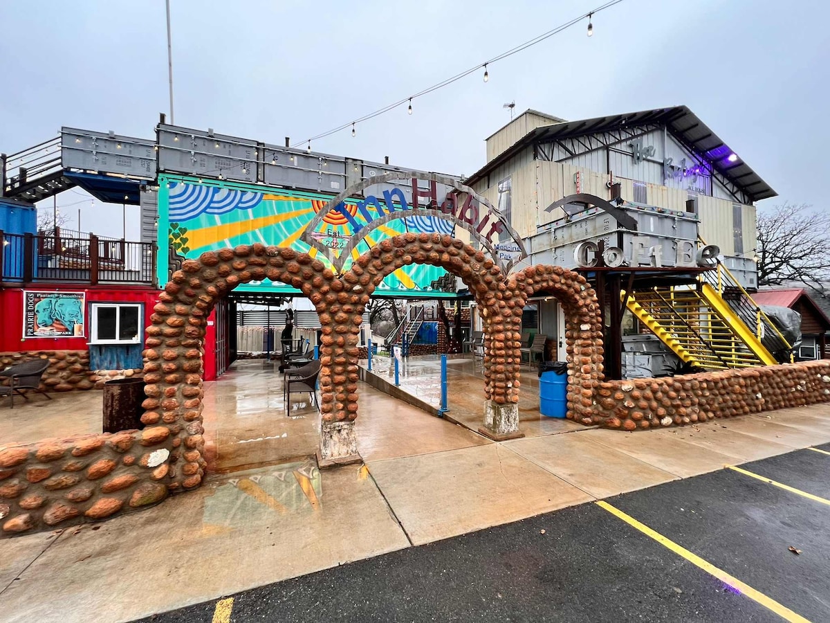 Cozy, fun, and walkable tiny-homes in the heart of Medicine Park just outside Fort Sill. These stylish container-built units are perfect for couples, friends or small families—each with its own patio or deck, Smart TV, WiFi, kitchenette, and access to the community grill and central gathering gazebo. A short stroll away you’ll find shops, restaurants, trails and Bath Lake. Price increases based on # of guests & pets.