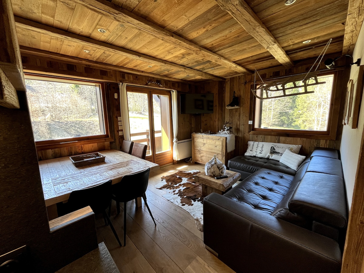 Appartement récent de 45m³ en rez de jardin dans un chalet individuel, disposant d'une grande chambre, d'une cuisine équipée, salle de bain avec baignoire et WC, TV et wifi avec une vue sur la vallée, le village et le massif du Mont Blanc. L'emplacement permet un départ "ski aux pieds", arret navette village devant le chalet, ou acces en voiture a 5mn. Proximité des restaurants et commerces. Arrivée autonome par coffre à clé. Idéal pour un couple, ou une petite famille!