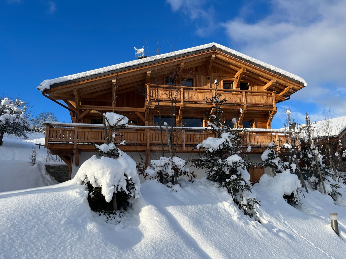 Grand chalet panoramique (190m2) face au Mont Blanc et proche d'un lac de baignade. Classé 4 épis. 4 chambres spacieuses (literie en 3*160cms et 2*90cms). 3 salles de bain dont 2 avec grande douche italienne et 1 avec baignoire. Sauna traditionnel avec vue panoramique par son hublot géant, vrai moment de détente et de récupération après l'effort ! Home Cinema - Babyfoot BONZINI - Enceinte CABASSE- Plancha Gaz etc...