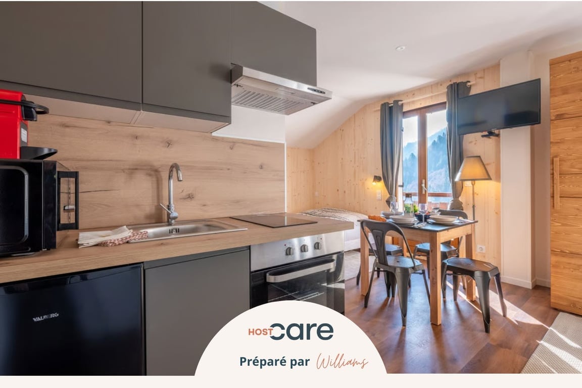 Studio neuf de 2017. Il est équipé d'une grande cuisine, une petite chambre avec lits superposés et d'une salle de bain avec toilettes. Vous pourrez aussi profiter de la terrasse avec plancha, transat...Location avec linge de maison (couettes, oreillers, housse de couettes et serviettes) le studio est situé en plein centre de la station a proximité de l'arrêt des ski bus et des commerces. nous n'acceptons pas nos amis les animaux.