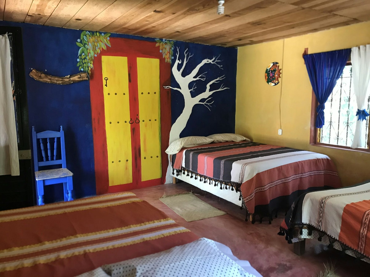 Habitación para 6 personas equipadas con todo lo necesario para hacer tu estancia cómoda y agradable. Con baño privado. 3 camas matrimonial. Contamos con lavadora (con costo extra). Las habitaciones están rodeadas de árboles, ríos y lagos. La alberca es perfecta para disfrutar con tu familia y amigos. En nuestro restaurante podrás desayunar, comer y cenar. Tenemos opciones vegetarianas y veganas, así como antojitos típicos de la región