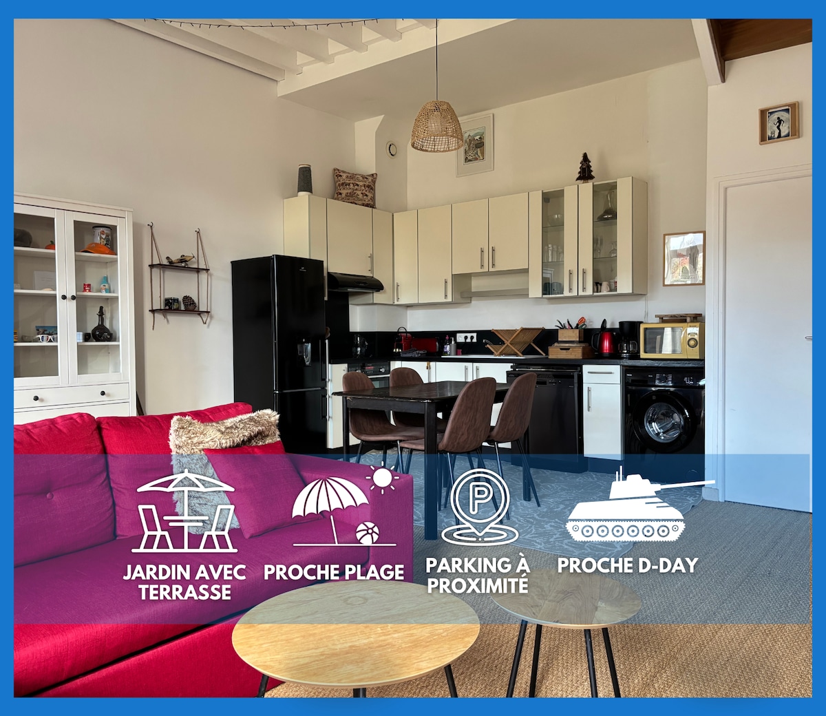 In Port-en-bessin At the heart of the Landing sites (D-Day) between Omaha beach and Gold Beach. Renovated apartment, on the ground floor, in a quiet and pleasant residence A bedroom (queen size bed) with a slight view of the port Living room with two large glass doors , double sofa bed, big TV. A fully equipped kitchen open to the living room. A bathroom with a large shower. A private parking space at the doors of the apartment. All shops within 2 minutes on foot.