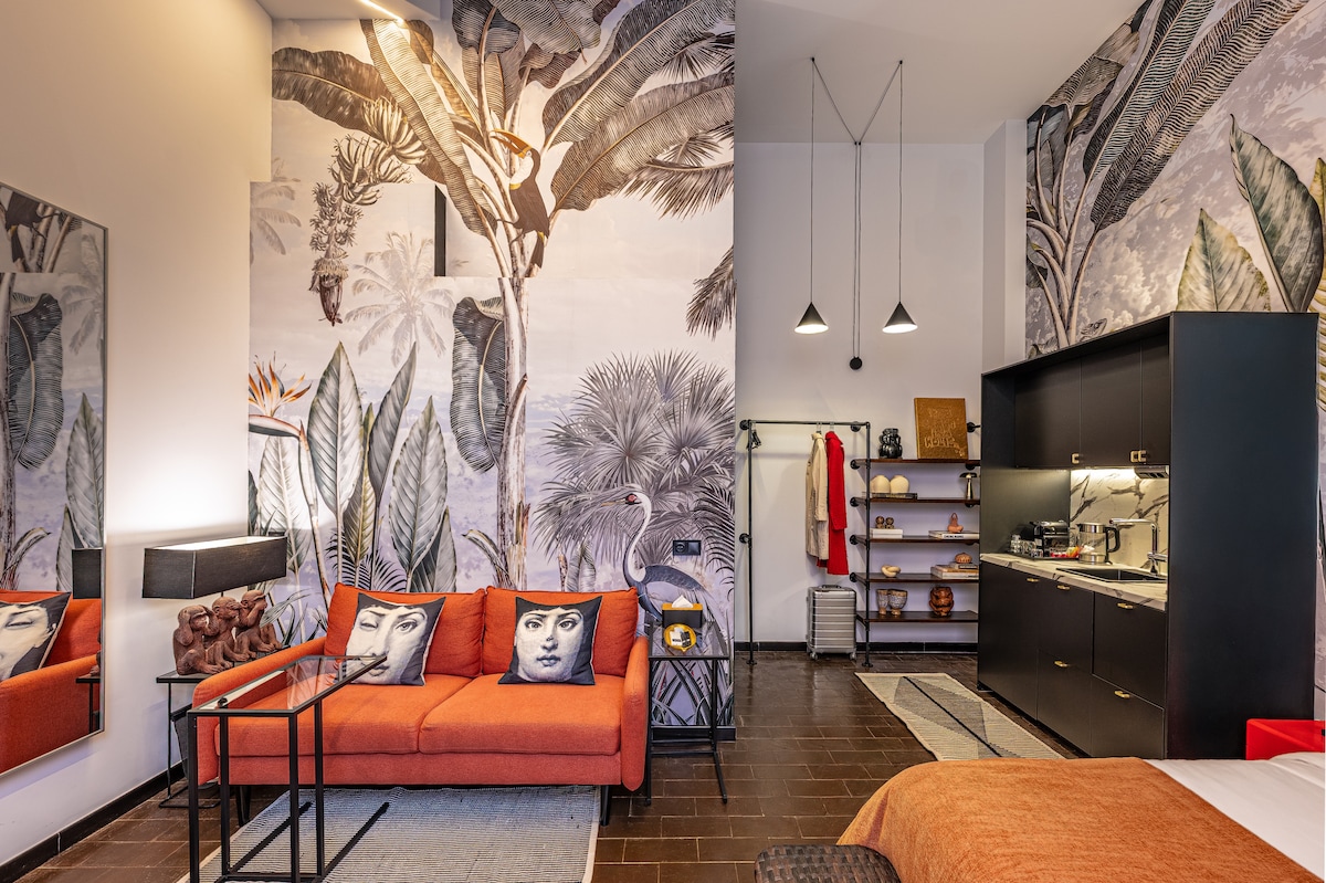 Can you imagine staying right next to the Royal Palace, in the very heart of Madrid? In a safe and elegant neighborhood, this cozy self-contained studio features over 4-meter-high ceilings and an immersive jungle-themed design, with tropical murals that transform the space into an urban oasis. A fully equipped kitchen and a stylish bathroom with a rain shower. Located in the heart of Madrid, with excellent connections by train, metro, and bus.