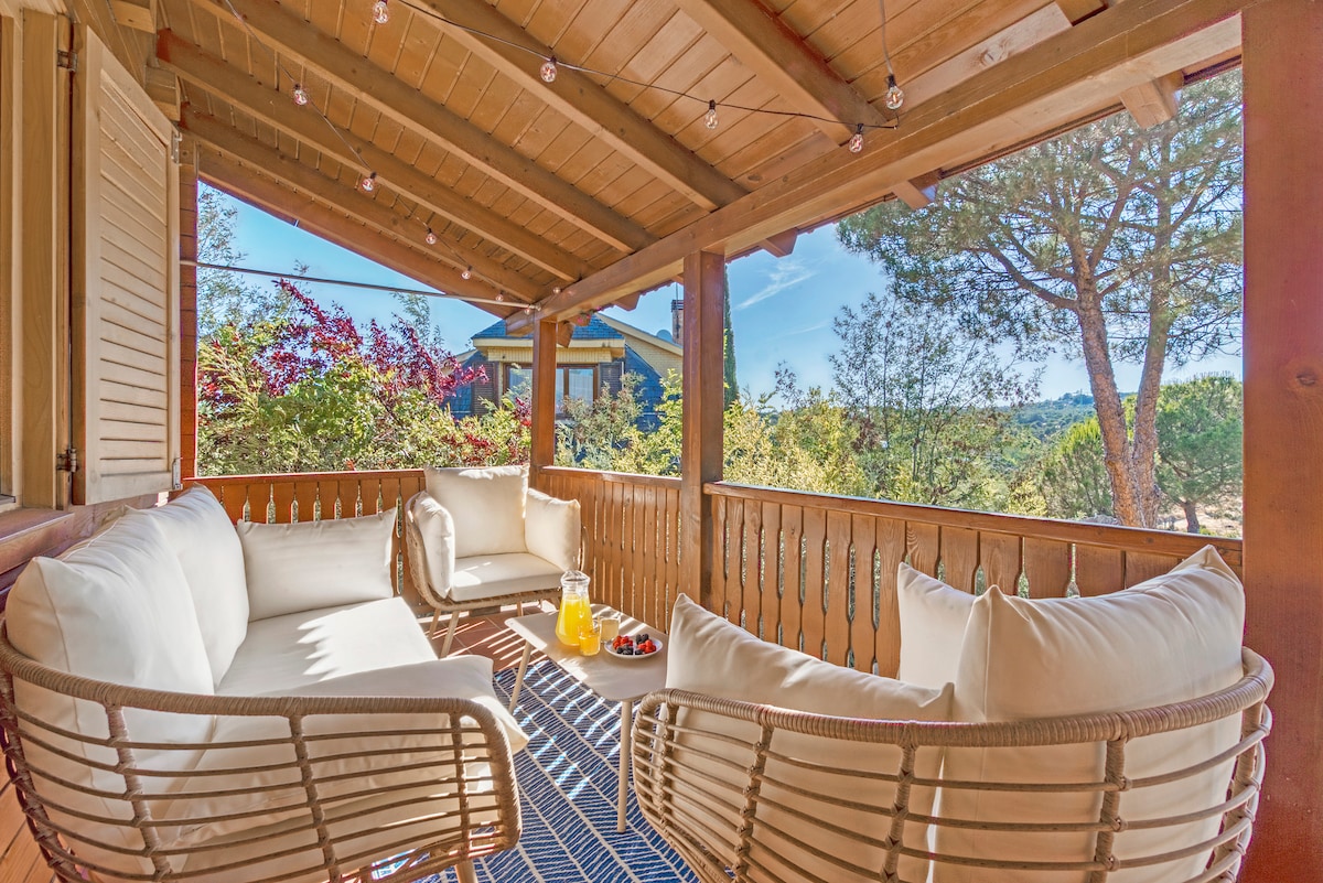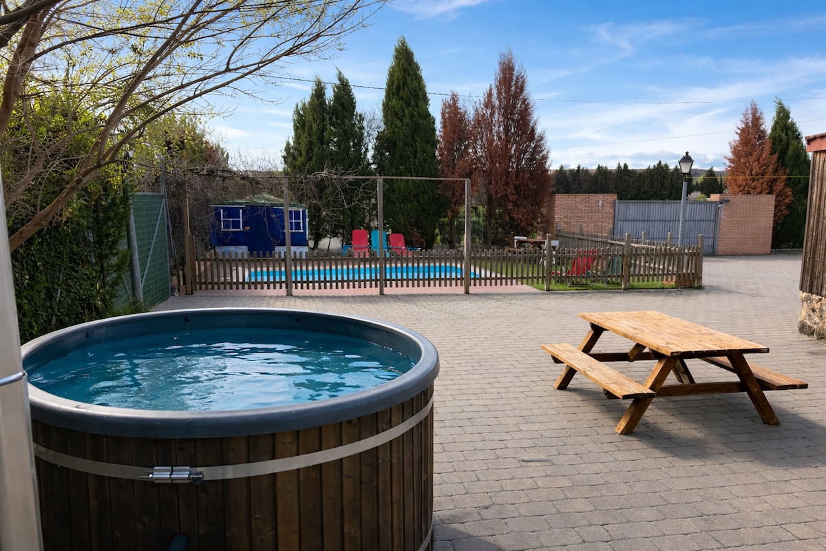 Discover this eco-friendly cabin less than an hour from Madrid, perfect for disconnecting among trees and silence. Unwind in the 40°C jacuzzi under a starry sky, or enjoy breakfast under the pergola surrounded by greenery. Complete privacy and a 950 m² fenced plot so your dogs can run free and safe. 🏙️ Madrid – 55 minutes by car 🏞️ San Juan Reservoir – 12 min by car 🌳 El Castañar (and hiking trails) – 15 min by car