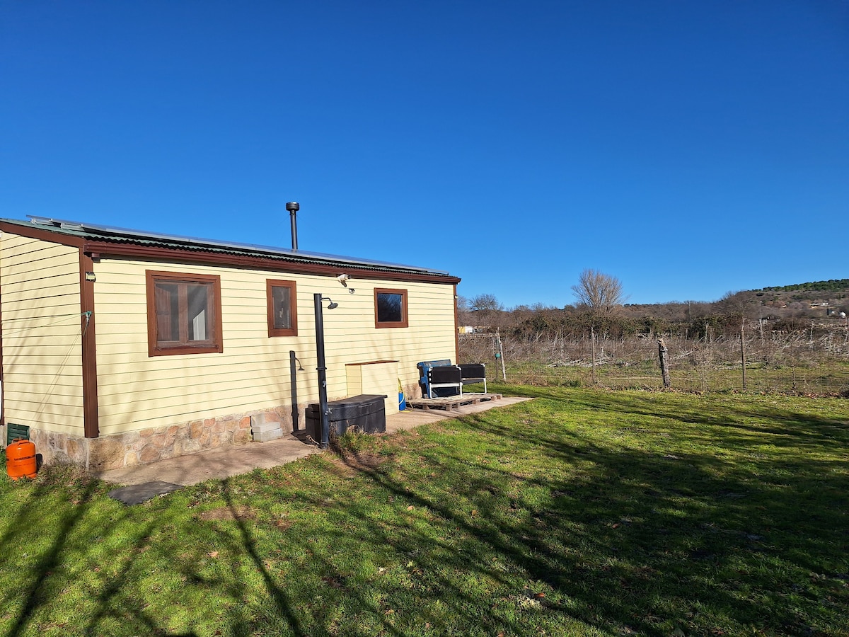 Cabaña rústica con encanto. Naturaleza y desconexión total en un paraíso a 1.30h de Madrid. - Equipada con comodidades. - Actividades acuáticas en la zona. - Rutas de montaña y naturaleza. Equitación 10 min/coche. - Restaurantes con auténtico sabor abulense en la zona. - Amplio jardín con árboles. La finca se comparte con otras casas pero cada una tiene su gran jardín y entrada privada. -Muebles de jardín. Comedor. Tumbonas. Pequeña barbacoa.