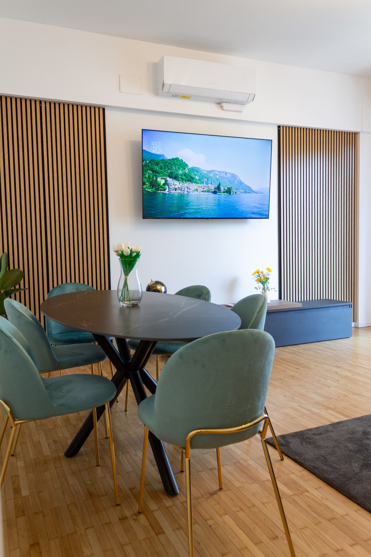Panoramic top-floor air-conditioned apartment consisting in one panoramic ‘LIGHTHOUSE-TOWER-style’ living room, one spacious twin bedroom, one single bedroom, 2 bathrooms, kitchenette and large sun-deck. We are one of the few listings including the «TICINO TICKET» for FREE use of all public transport in Canton Ticino during your entire stay. Free use of swimming-pool in the garden, extensive breakfast buffet from 6:30 to 10:30 is included and parking available on site for a fee.
