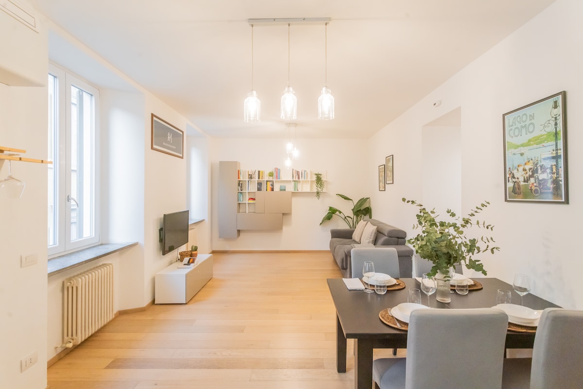 Bright, elegant and quiet apartment just renovated and furnished with elegance. Located on the first floor of an elegant building with elevator. Equipped with air conditioning and large 70 square meters plus balcony. Located 50 meters from the train station Como Borghi with connections to Milan downtown and Malpensa Airport. Apartment few meters far from the charming covered food market, close to the historical center and only 10 minutes walk from the lake. Private garage nearby the building.