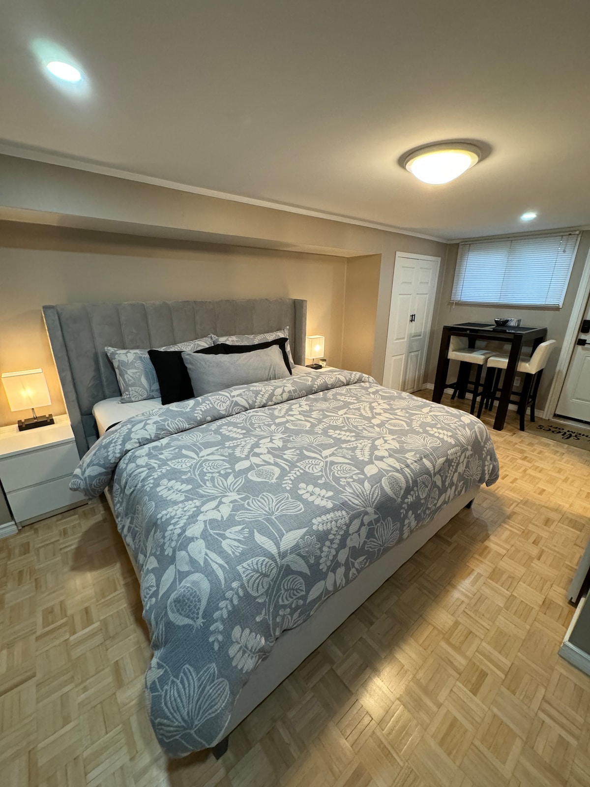 Welcome to our newly renovated self-contained suite, conveniently located close to the city center and attractions. With a private entrance, enjoy privacy and flexibility. The suite, situated on the ground level basement, offers ample natural light. Inside, find a cozy bedroom with a queen-sized bed and a studio double bed with curtains for privacy. The living room also has a sofa bed for additional sleeping space. Stay connected with free WIFI and parking in the safe neighborhood.