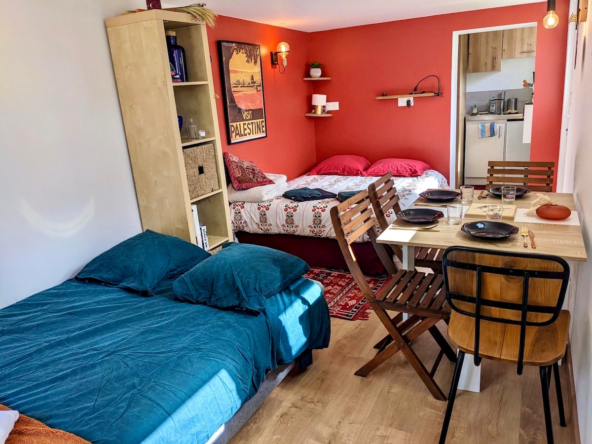 Studio avec canapé lit 2 places queen size, kitchenette lavabo et double plaque chauffante,frigo et cafetière tassimo + capsules, four micro-onde, table pivotante avec 2 sièges de bar à hauteur réglable. Espace bureau Une .salle de douche avec WC et lavabo. Commode, télévision. ventilateur, Wifi gratuit.