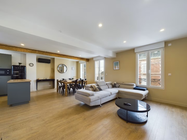 Voici notre appartement T3, situé au centre ville, à 5 min de la gare et du Palais de Compiègne. Entièrement rénové, il combine espace et modernité. Ses 2 chambres ainsi que le canapé convertible dans le salon permettent d'accueillir jusqu'à 6 personnes. Appréciez la vue sur l'Oise, avec une smart TV pour vous détendre et un bureau pour travailler dans les meilleures conditions. La cuisine est entièrement équipée. Il est idéal pour tout séjour à Compiègne qu’il soit touristique / professionnel.