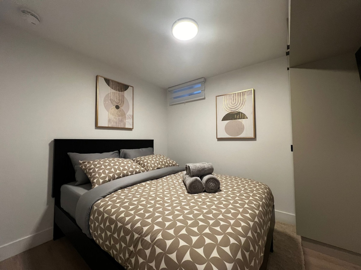 This cozy apartment envelops you in comfort with fine linens and textiles boasting rich textures, creating a warm homey ambiance. Highlights: * Entire brand new condo all to yourself (including full kitchen, washer/dryer, bathtub and shower) * Seamless checkout with minimum tasks * Access to in-building terrace and gym * Convenient parking & public transport * 3 mins to supermarkets, 10 mins to Downtown & 15 mins to airport *We can add an extra bed in the room to accommodate up to 5 people.