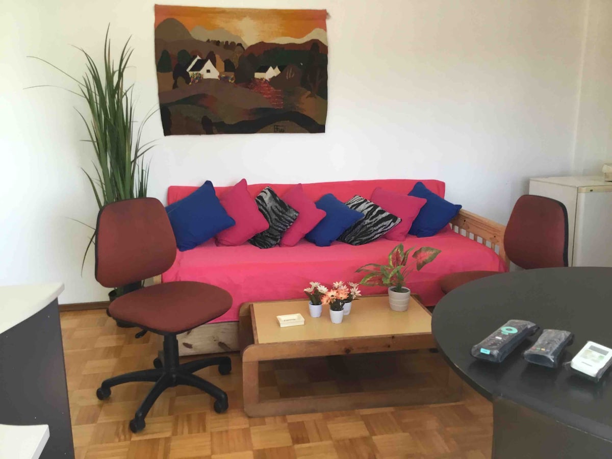 El departamento se encuentra remodelado a estrenar con detalles de muy buen gusto en su decoración y un moderno equipamiento. Se encuentra a metros de la Avda. Santa Fe donde están las mejores tiendas de la ciudad y muy conectado con sus medios de transporte. El cuarto principal tiene una cama "super king" que puede armarse entera o separada en dos camas individuales. Las almohadas son "inteligentes" y la ropa de cama asi como las toallas de muy buena calidad. Los electrodomesticos son nuevos y consta de horno y anafes electricos, microndas, cafetera, pava electrica, tostadora de pan y heladera con frezeer. El aire acondicionado es frio/calor y el cuarto ademas, tiene un ventilador de techo para los que no toleran el aire frio directo. El agua caliente proviene de la caldera central del edificio por lo que facilita prolongados y agradables baños. Bajo la mesada de la cocina hay un moderno lavarropas. Todas las puertas tienen cerradura con llave y el cuarto puede cerrarse desde su pasillo de acceso, quedando de esa manera en "suite privada " con el baño. Me gusta socializar, puedo atender a los en cualquier momento, por mail o por celular. Vivo muy cerca del apartamento, puedo acudir si me necesitan. Facilito a los huespedes una tarjeta de transporte publico de cortesia que luego puede recargarse en los kioskos cercanos. Sobre la mesa del comedor dejo las instrucciones de la casa asi como una guia con recomendaciones sobre compras en el supermercado, comercios cercanos y lugares para comer con precios acomodados y buena calidad de comida. Puedo asesorar personalmente a mis huespedes sobre lugares de interes turistico, restaurantes o lugares de moda divertidos, museos, galerias de arte o shoppings. Se trata de una exclusiva zona residencial, donde hay numerosos bares, restaurantes y boutiques para conocer y pasear. A metros de una de las plazas mas bellas de la ciudad. Se encuentra a metros de la Av. Santa Fe donde circulan gran cantidad de lineas de colectivos que te llevan en pocos minutos a los principales sitios de interés de la Ciudad. También se encuentra a 5 cuadras del metro (subte). Al llegar les entrego una tarjeta de transporte publico de cortesia que puede recargarse en los kioscos y una guia de los principales lugares de interes. El check in posterior a las 20.00 horas tiene un costo adicional de U$S 20. Si la estancia es mayor a 8 dias, se les.entrega un juego de sabanas y toallas de recambio.