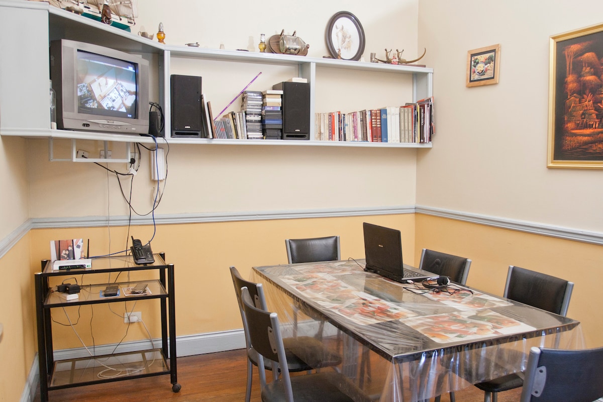Comfortable, spacious place with a great rooftop terrace. Unassuming from the street, this house will steal your heart. Walk up a white marble staircase to be greeted by a whimsical sculpture by a local artist in the foyer. On one side, you can relax in a living room with 3 balconies, a grand library and a wood stove. On the other side is a formal yet intimate dining room with a bar. The master bedroom has a vast walk-in closet and en-suite bathroom with JACUZZI for relaxation by moonlight!