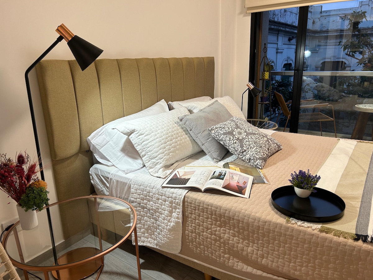 Relajate en este alojamiento único y tranquilo. Departamento luminoso con balcón a la calle, decorado con muebles de madera hechos a medida y detalles cálidos. Cama doble muy cómoda, TV, living integrado y cocina equipada con todo lo básico para cocinar. Wi-Fi rápido y mucha luz natural todo el día. Es un espacio sencillo pero con mucho estilo, ideal para parejas o viajeros que quieran sentirse en casa, descansar y hacer base para conocer la ciudad.