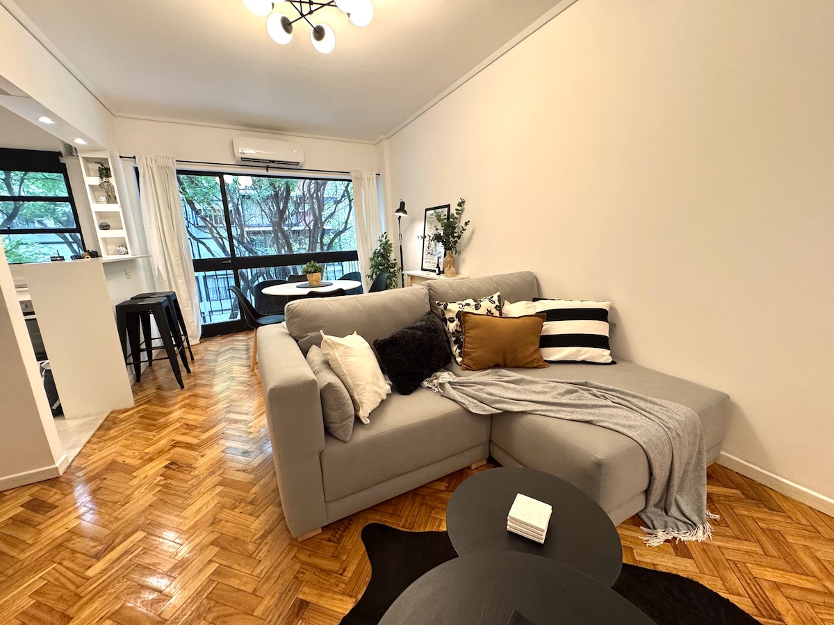 Wake up with the beautiful green view of the trees in the background, in this warm and comfortable apartment in the lively neighborhood of Palermo, surrounded by museums, shops, supermarkets and plenty of nice restaurants/bars to have a drink at sunset...With an unbeatable location it is an excellent starting point to visit the different neighborhoods of Buenos Aires. Building with security 24h/day. Internet speed 100 Mbps The apartment is cleaned with extra precautions and sanitized thoroughly. Apartamento de 50 m2 con vista verde, con balcón, en el corazón de Palermo. Tiene 1 dormitorio con cama matrimonial y 1 sillón cama de 1 plaza en el living. Black out en dormitorio y living. Posee caja de seguridad. Excelente ducha. Equipado con Internet Wi-Fi, posee 2 TV : una de 42" en el living y otra de 32" en la habitación con Netflix, 2 aires acondicionados, calefacción, microondas, tostadora, 1 gran heladera, cafetera y termo eléctrico, tender extensible para el secado de la ropa, plancha y tabla de planchar. El departamento ha sido reformado en mayo 2016, esto incluye pisos nuevos, colchón nuevo de alta calidad así como ropa blanca. En diciembre 2016 se colocó una cocina nueva, eléctrica. Me encuentro disponible en el celular para cualquier solicitud, consulta o recomendaciones sobre la ciudad de Buenos Aires o sobre el departamento. Apartment located in a safe and lively area, with a fantastic location that includes green spaces and an important gastronomic and cultural center very much appreciated of the city. Near the main cultural and touristic attractions. Steps from all means of public transport. Walking distance to Malba Museum. Only 10' from the Jorge Newbery National Airport. Ubicación muy práctica para moverse en BA con todos los medios de transporte públicos a 3 cuadras en Av.Las Heras y a 1 cuadra en Av.Libertador. Personas adicionales sin cargo. Se hace una limpieza general por semana con cambio de ropa blanca sin cargo. El departamento tiene puerta blindada y abajo en la recepción hay guardias de seguridad las 24h. Posee caja de seguridad.